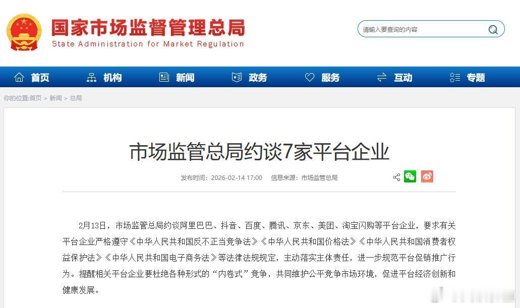 2月13日,市场监管总局约谈阿里巴巴、抖音、百度、腾讯、京东、美团、淘宝闪购等平台企业,要求有关平台企业严格遵守《中华人民共和国反不正当竞争法》《中华人民共和国价格法》《中华人民共和国消费者权益保护法》《中华人民共和国电子商务法》等法律法规规定,主动落实主体责任,进一步规范平台促销推广行为。提醒相关平台企业要杜绝各种形式的“内卷式”竞争,共同维护公平竞争市场环境,促进平台经济创新和健康发展。🌹