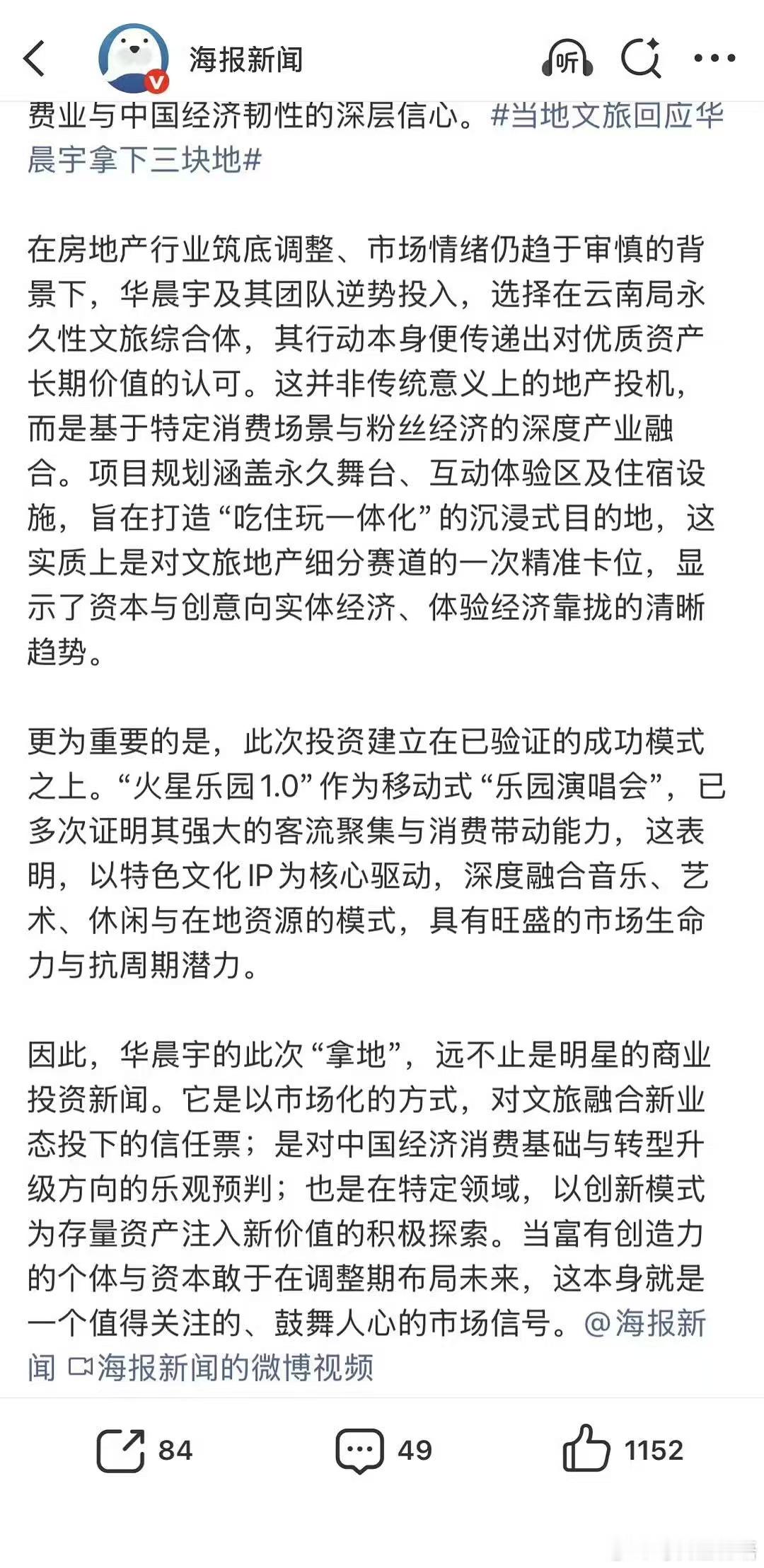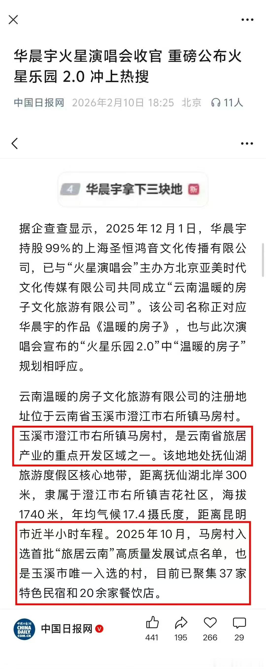 华晨宇拿下三块地文旅推动支持 拿下三块地打造火星乐园2.0,项目获央媒关注,当地文旅积极推动、全程助力,官方回应:非常期待项目落地。火星乐园2.0正式推进,将打造专属音乐文旅地标,带来长期价值。花花在演唱会创新探索上真是太超前了。