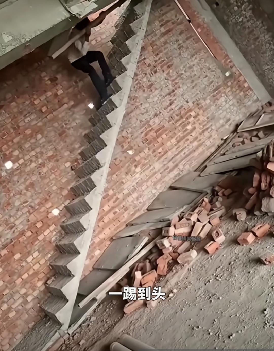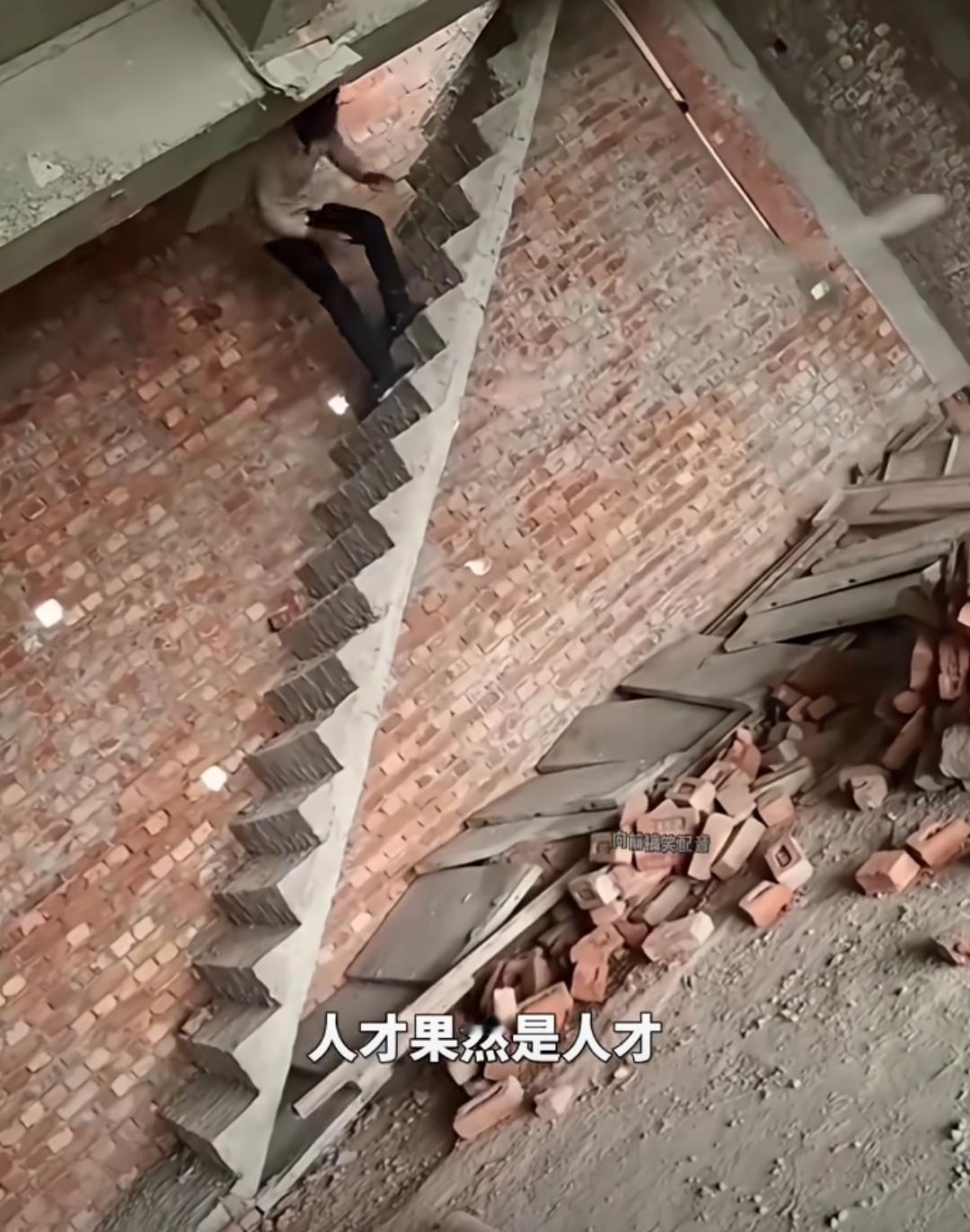 越往上走,就越得低头,稍不留意还容易碰头。能设计出这样的楼梯,真可谓是“人才”中的“人才”! 瞧瞧画面里的场景,一座一折到顶的楼梯,只因没考虑到前方有下沉梁体的高度,师傅拆模时越往上走越得低头前行,场面十分尴尬。看到这画面,难免让人对设计这种楼梯的人满腹怀疑,这人难道是来混工资的? 这种让人低头的楼梯,即便现在建好了且已拆模,也难保不会因验收不合格而拆除重建。拆除造成的损失,想必少不了要赔偿吧! 楼梯新做法
