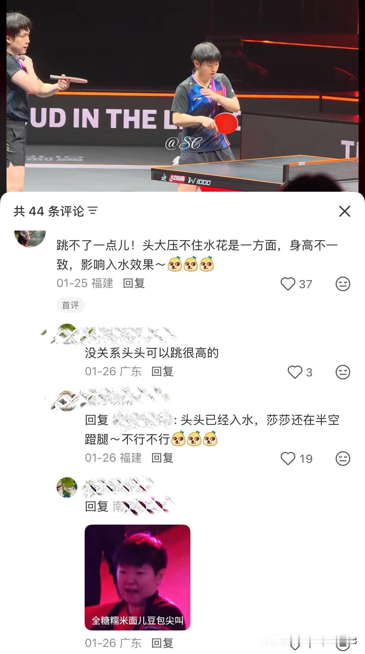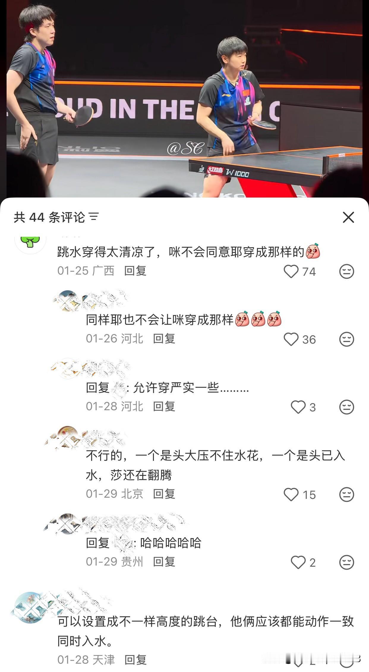 莎莎楚钦,撩衣,擦手,吹手,动作出奇的一致,有人说送去跳水, 被网友的回复给笑晕了。 话说回来,这个还真是特别的一致,谁也没看谁,但就是这么的默契, 真不愧是八年,第九年的搭档了, 心是在一起的,没错了。 看网友的评论能笑得肚子疼, 一个头大压不住水花,一个已入水,莎莎还在半空翻腾😁😁 网友:跳不了一点,一个三米跳板,一个十米跳台,还差不多😁