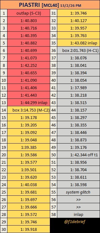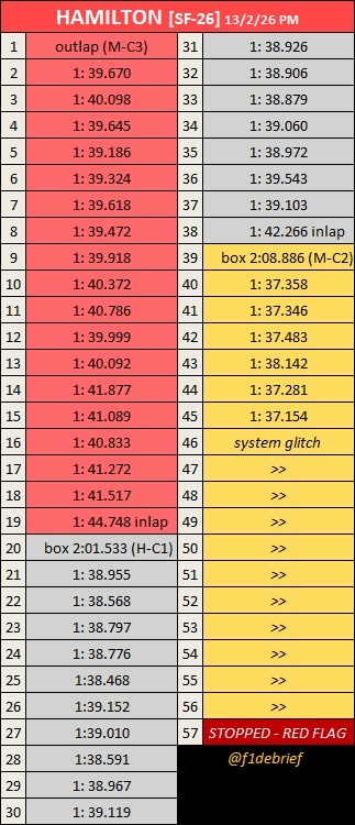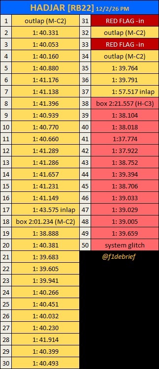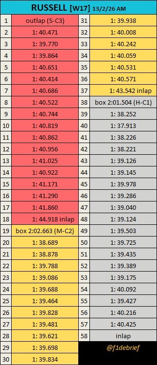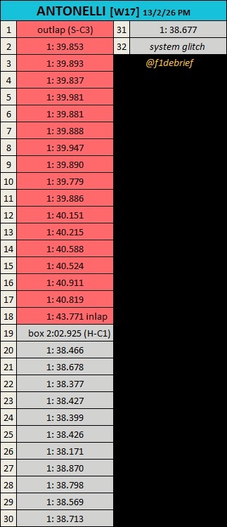安东内利、拉塞尔(上午)、汉密尔顿、哈贾尔(第二天)正赛模拟情况。第三天下午后段的时候LT出现问题,少了一些单圈。