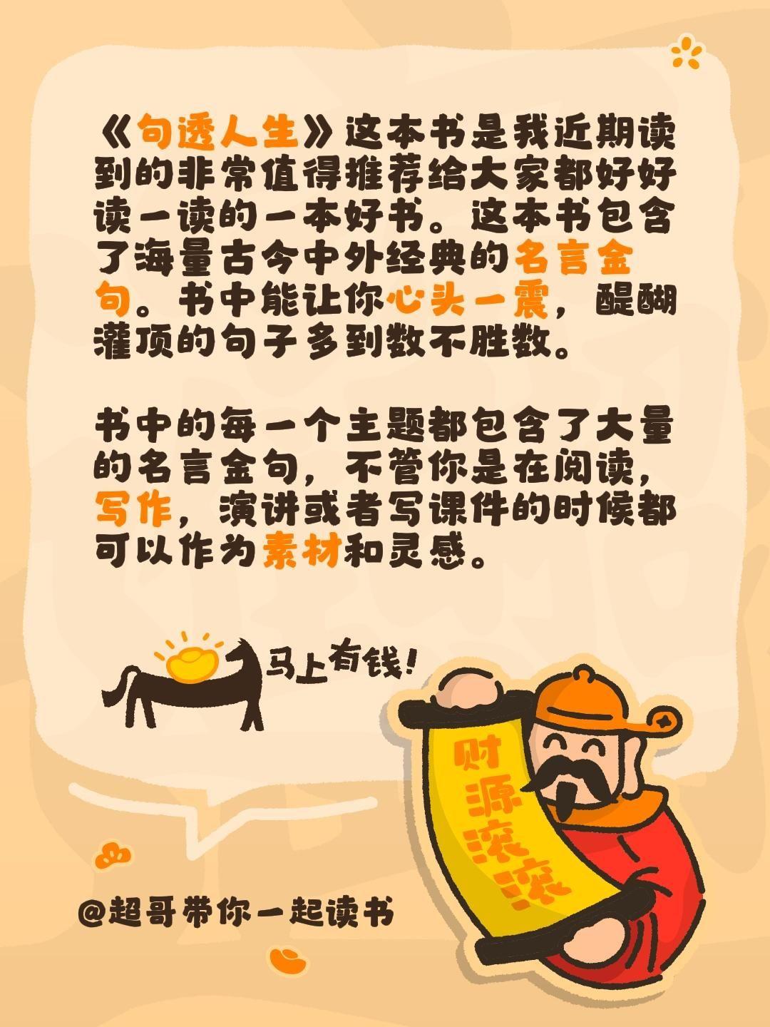 《句透人生》这本书是我近期读到的非常值得推荐给大家都好好读一读的一本好书。这本书包含了海量古今中外经典的名言金句。书中能让你心头一震,醍醐灌顶的句子多到数不胜数。 书中的每一个主题都包含了大量的名言金句,不管你是在阅读,写作,演讲或者写课件的时候都可以作为素材和灵感。名言金句 人生哲学书籍 句透人生 语录短句书籍