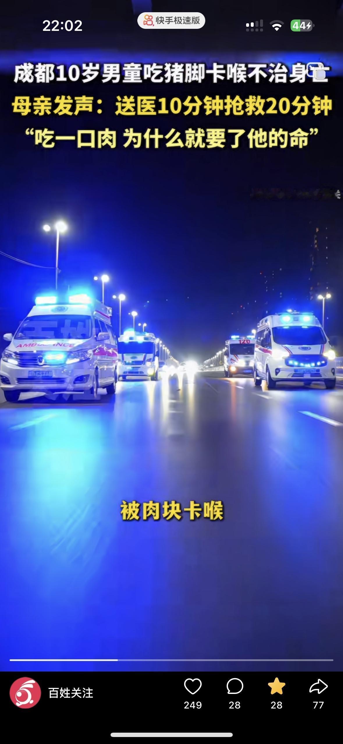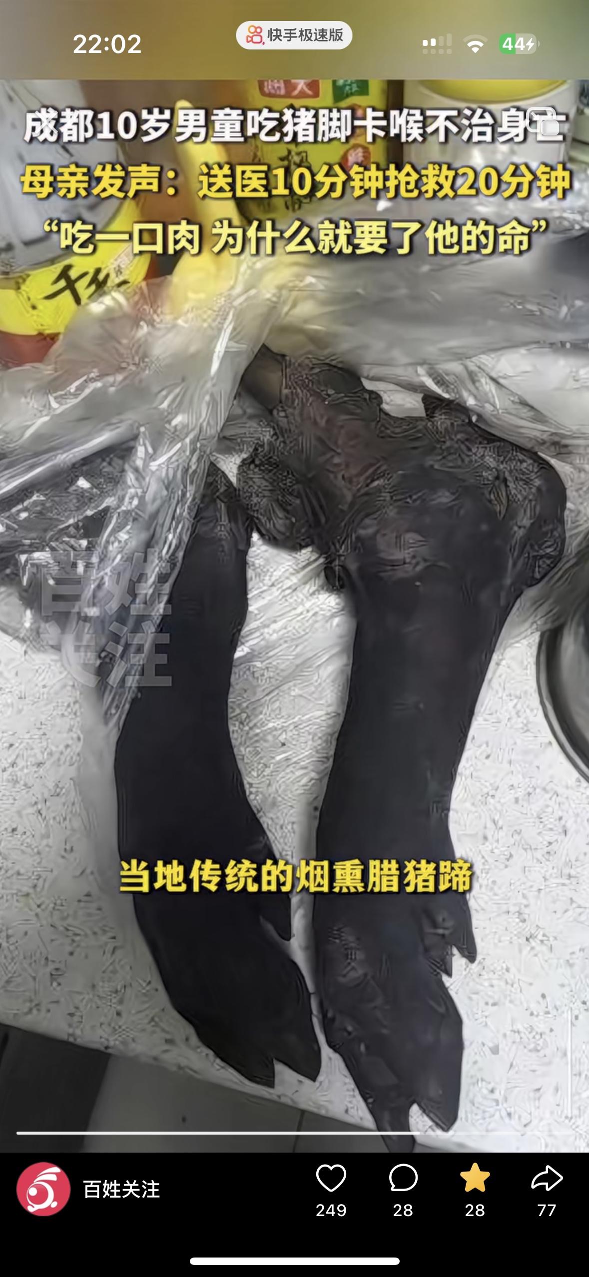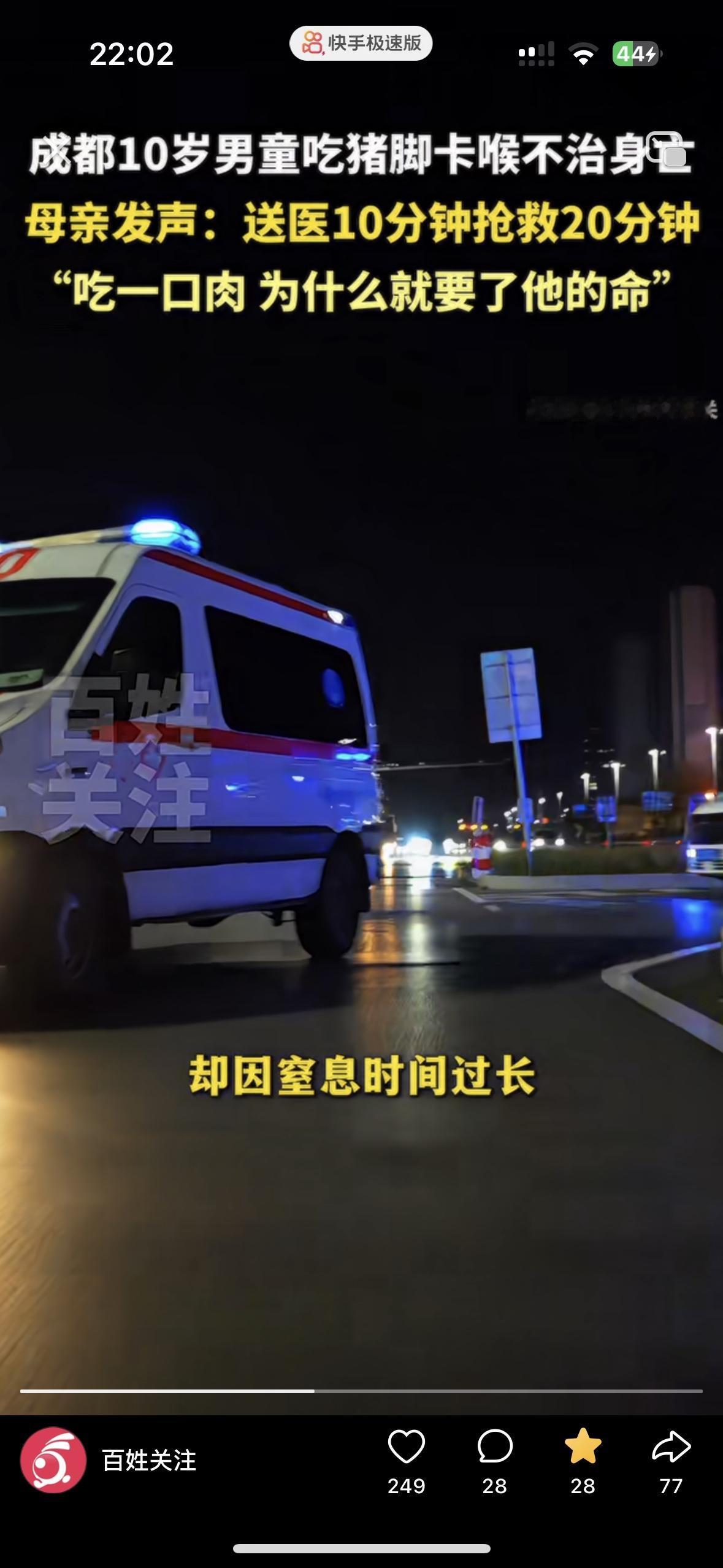 这个年对这个妈妈来说简直是生不如死 过年家家户户都想给孩子吃点好的,她怎么也想不到却送走了儿子的命 10岁男孩本来在家开开心心的玩耍,妈妈顺手喂了他口猪蹄,孩子当时就被卡住,脸色发紫,剧烈呕吐。家人拉着他送往医院,短短的路程却像走了一辈子,医生拼尽全力抢救20分钟,孩子从窒息到呼吸衰竭,再到严重的脑损伤,十几种病症压在一个小孩子身上,最终还是没挺过来。年还没到,孩子没了,可让一家人怎么活啊