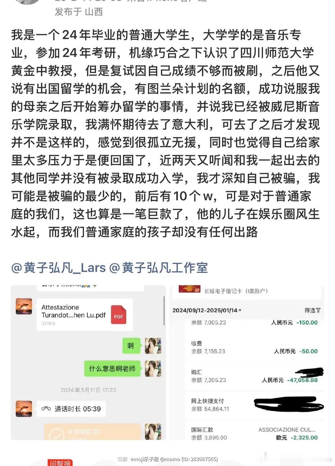 来吃瓜。这个博主的意思是黄金中教授是黄子弘凡爸爸吗? 这个博主意思是黄教授收了钱不办事? 曝黄子弘凡爸爸诈骗学生
