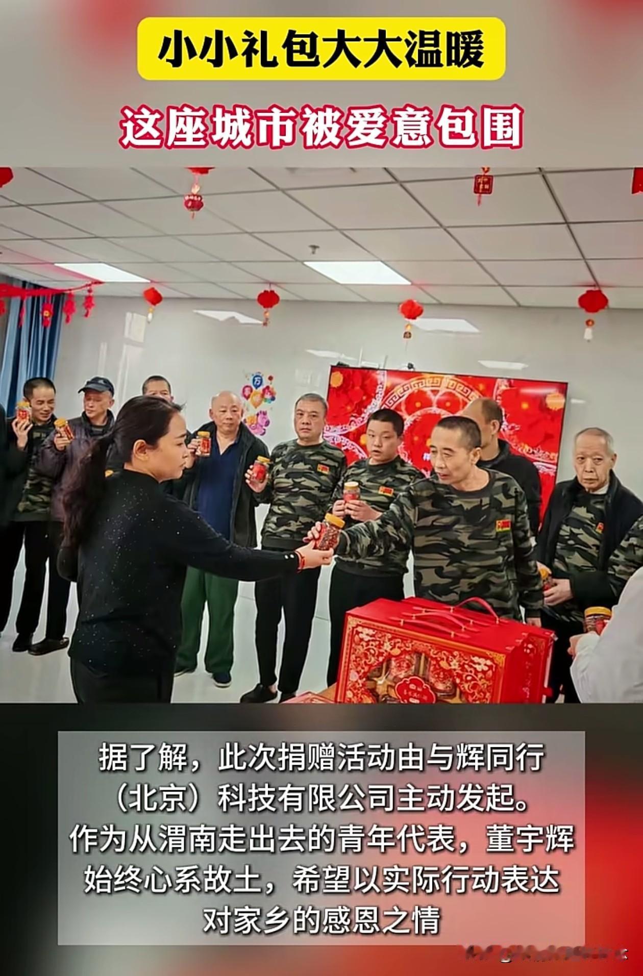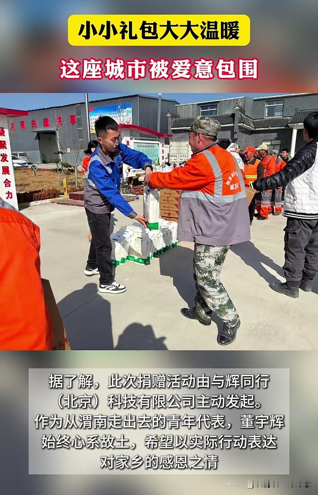 “与辉同行”的公益行终于来到了他的家乡渭南市!宇辉向家乡一线劳动者和困难群众捐赠了一万份爱心礼包! 据渭南广播电视台微信公众号报道,“与辉同行”这次捐赠的物品也是坚果和大米,主要发放对象是敬老院老人,环卫工人,还有一些困难群体。 从西安到渭南,从高原牧区到家乡故土,宇辉用行动告诉大家:走出家乡不忘根,功成名就更念桑梓,把善意落到最平凡的人身上,这才是最动人的青年担当与企业格局。 这样的公益,最接地气,也最让人暖心。大家觉得呢? 新年生活图鉴 董宇辉