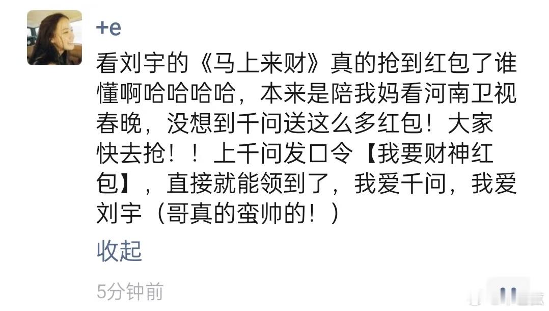 听刘宇唱马上来财领到千问红包刘宇宁这也太大方了吧!去千问就能领到红包,这下我又薅了一波羊毛