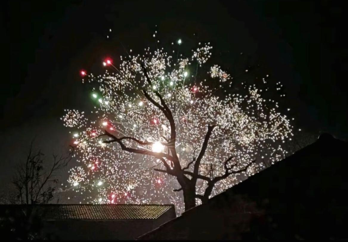 过年回村了感觉很无聊,感觉没有年味? 教你一招,买一些烟花,再找一颗枝干有型的树,到了晚上就开放,绚丽多彩的烟花树就出现了,特别出片,年味也足了! 当然还要注意一点,燃放烟花爆竹的时候,一定要注意安全,远离易燃放的区域,平平安安快快乐乐过年哈! 过年了