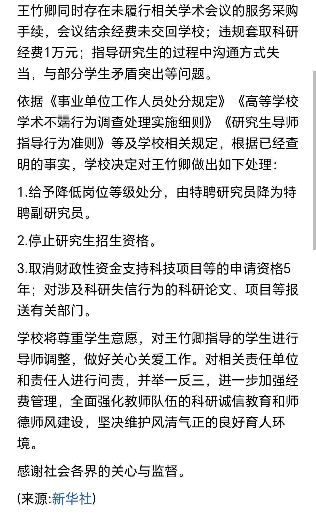 即使是这样,王竹卿也还是没有被川大开除,处罚不过是从特聘研究员降为副研究员、停止招生资格、取消资金支持而已。依然还可以继续留校任教,等风波过去后再操作也是容易的。 这说明他当初之所以那么对待手下的研究生,态度可以如此嚣张,是因为他这类人早就把规则研究透了,知道他这样做即使被学生举报了也是鱼会死、而他这样的网未必会破。 继川大张薇事件后,又以这样的方式见识到了川大在学术研究上的风采。建议举报的学生们还是尽快离开那里吧,你们已经输了。 被83页PDF举报 川大教师被处分王竹卿