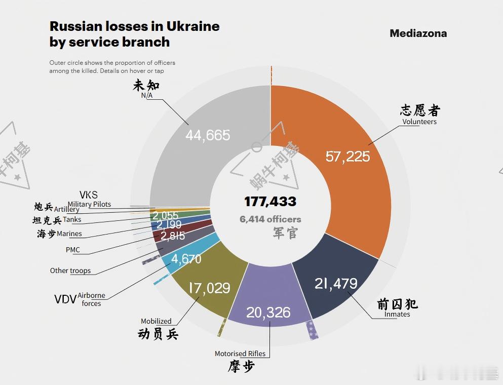 在兵种分布这边,摩步已经达到20,326,极为接近动员兵的21,479,估计下次统计就能成为第二大阵亡类型。去掉名单中未知的44,665,可以推算出正规军占比1/4,所以整体阵亡名单中正规军数据为4.4万。强调一下,已经打了4年,对俄罗斯职业军人的减员每年才1.1万,一个月1000不到……