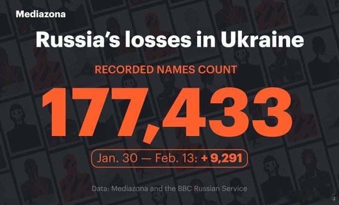 🇷🇺🇺🇦 俄罗斯反对派媒体Mediazona发布截至20260213俄军阵亡数据:177,433。整体俄方阵亡柯基按照超额死亡率推算约25万,而伤亡人次已经到了75万。