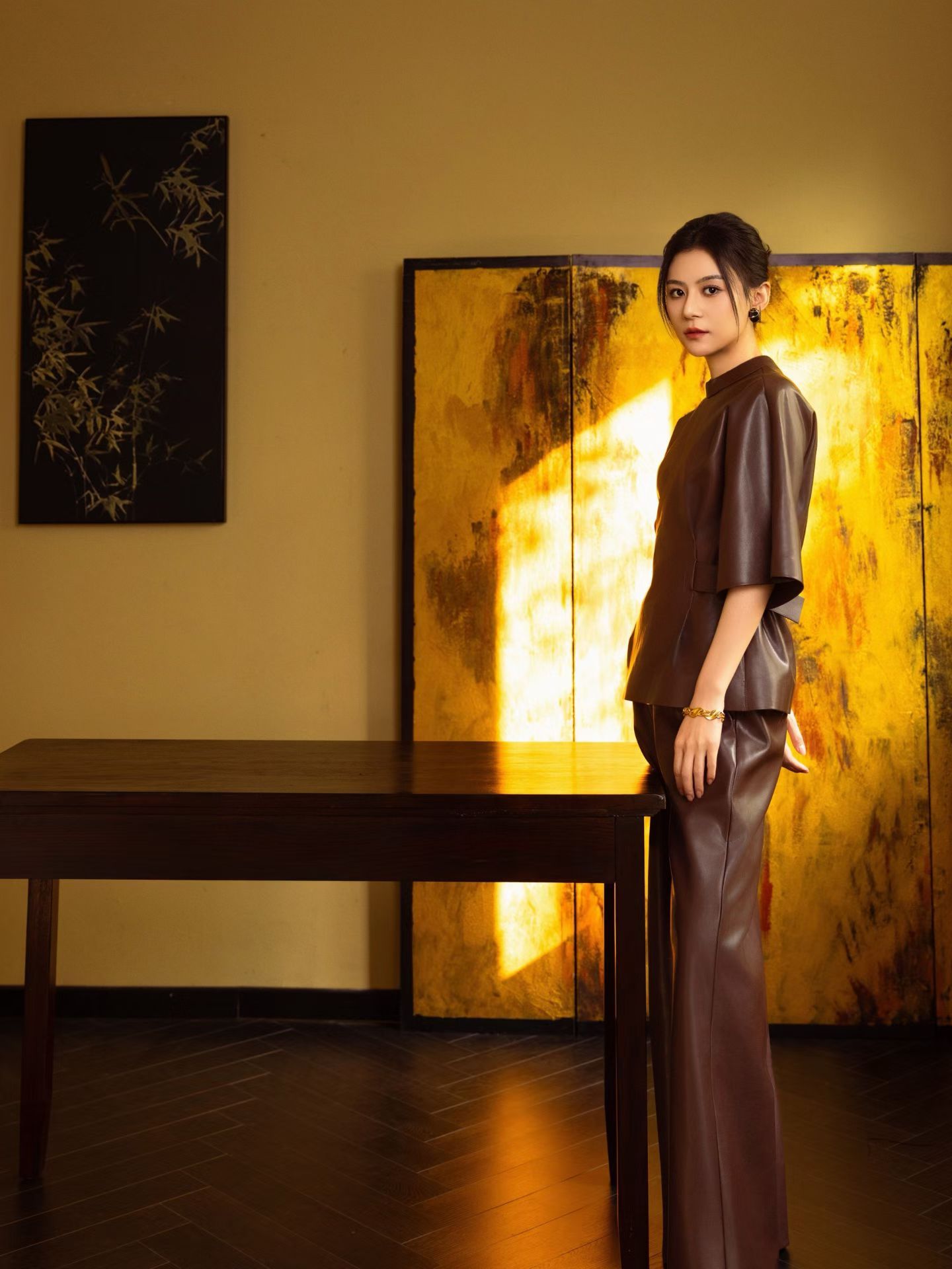 真的会反复为刘子鹤心动!新写真氛围感封神,墨竹挂画搭配鎏金屏风,雅致又高级。棕色皮裙中和了柔美,多了份飒爽,东方骨相 + 现代气质,温柔又有力量感!