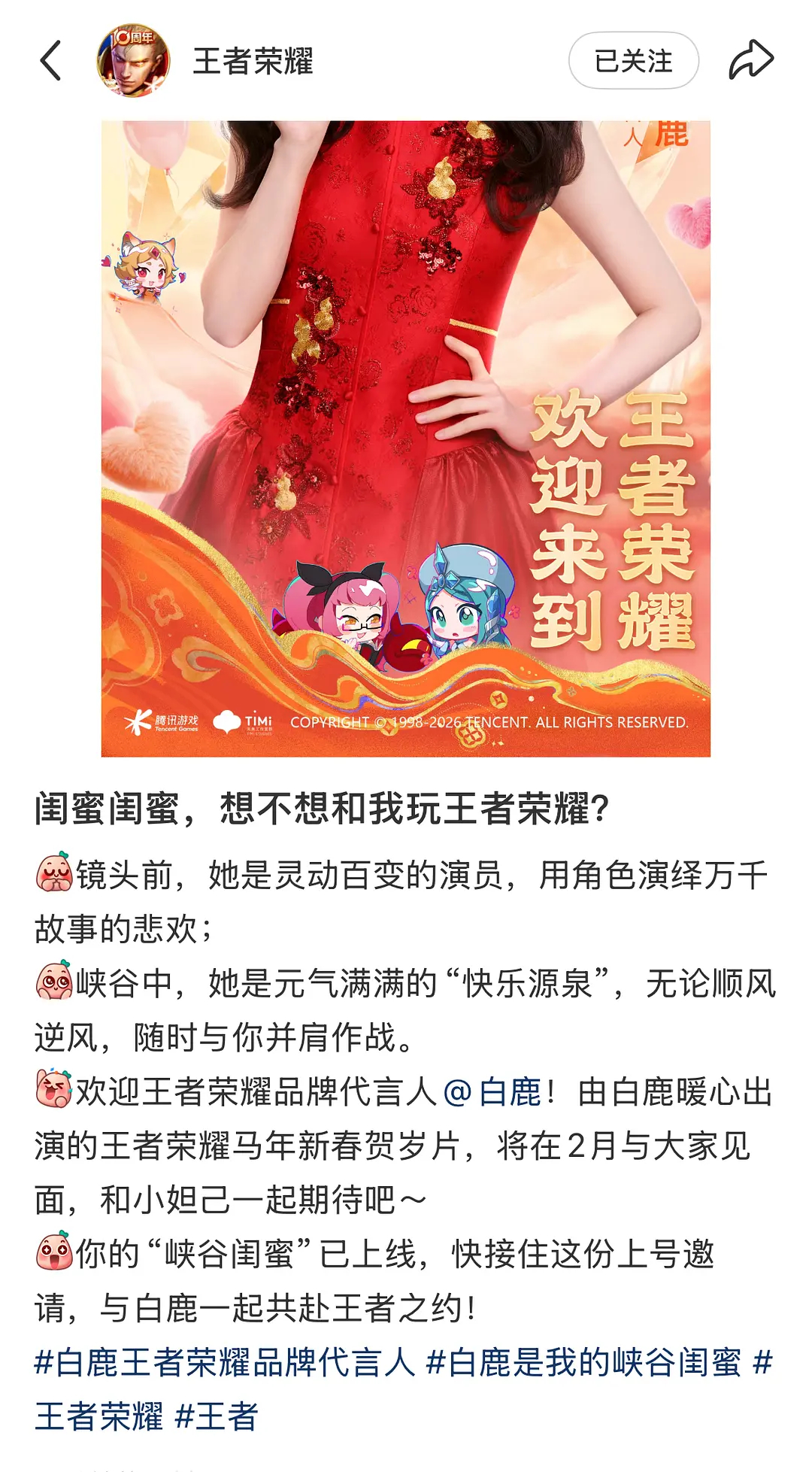 白鹿又成为王者代言人了 这是什么批发头衔吗?