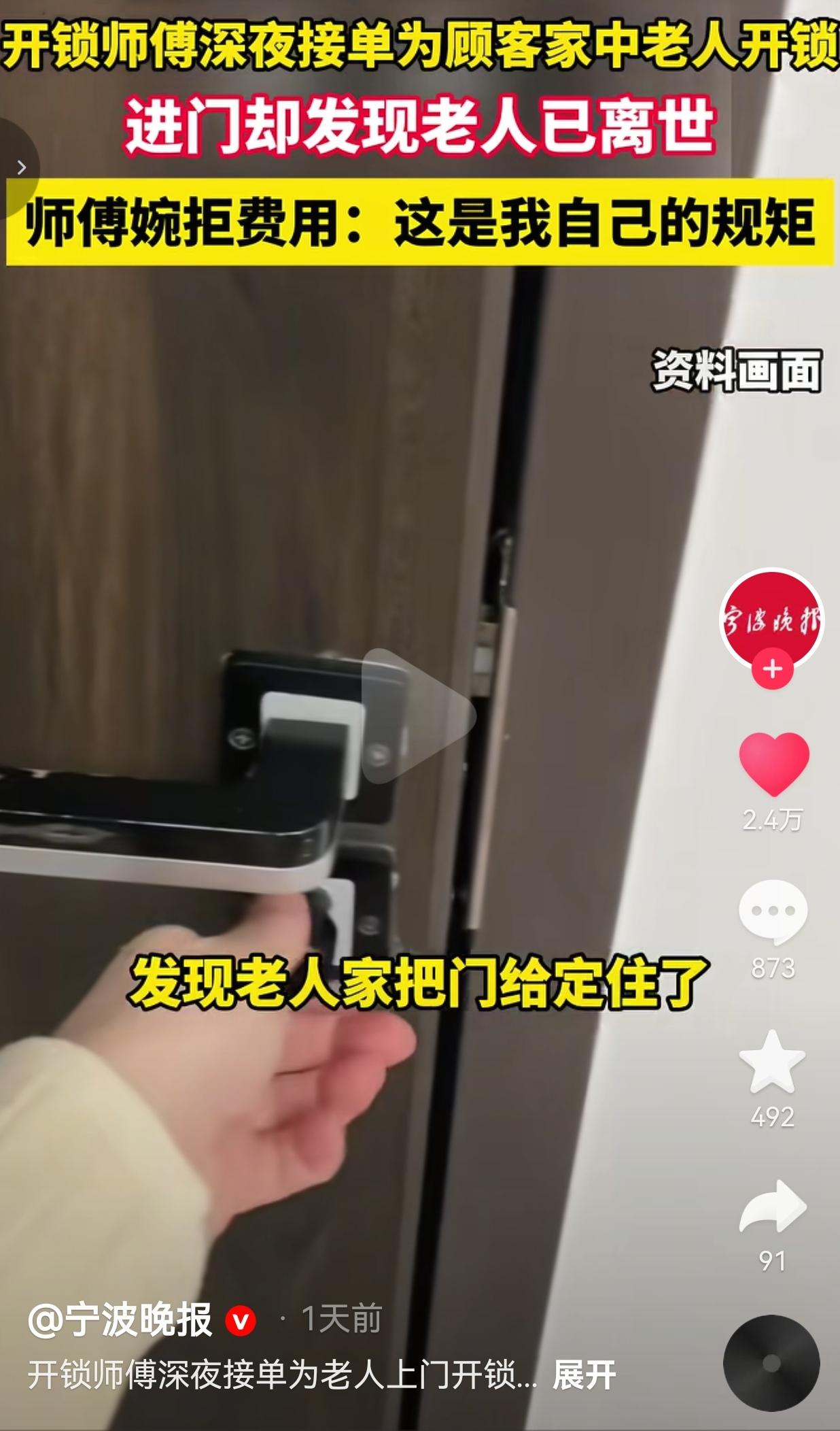 这个规定太有人情味了!2月13日,湖南岳阳的深夜,开锁师傅熊师傅接到了一通紧急电话。 电话那头,家属很是着急,让熊师傅赶紧来一趟,家属说:“给家里老人电话一直不接,这才上门去查看情况。结果,到了之后,发现门从里面反锁了,有钥匙也打不开,求你快来看看!” 熊师傅知道情况紧急,二话不说,拎起工具箱就往现场赶。 晚上11点多,他赶到现场,熟练地打开了门锁。可推开门的那一刻,他愣住了——老人已经在家中离世。 面对家属递来的开锁费,熊师傅摆了摆手,婉拒了。 他说:“一般这种情况我不收费,这是我自己的规矩,收也行,不收也行,我反正不收。” 此事传到了网上,引发网友的强烈共鸣,有的网友说:“这才是真正的手艺人,有手艺,更要有良心。” 也有的网友说:“他打开的不仅是一扇门,更是人心。” 还有的网友说:“规矩是死的,人是活的,这才是最动人的人情味。” 熊师傅深夜接单,本就是为了养家糊口,可当他推开门,看到的是一个家庭的破碎。 那一刻,他没有想着“我付出了劳动,该收钱”,而是本能地选择了共情。 他的“规矩”,不是写在墙上的条款,而是刻在心里的善良。 在生死面前,几十块、几百块的开锁费,显得那么微不足道。他用自己的方式,给了这个悲伤的家庭最后一点体面和温暖。 我们总说,这个世界越来越冷漠,人与人之间的距离也越来越远。 可熊师傅用行动告诉我们:善良从来都不是什么惊天动地的大事,而是在别人最需要的时候,选择多一份理解,少一份计较。 他的“规矩”,不是傻,而是一种选择。选择用自己的方式,守护这个世界的温度。