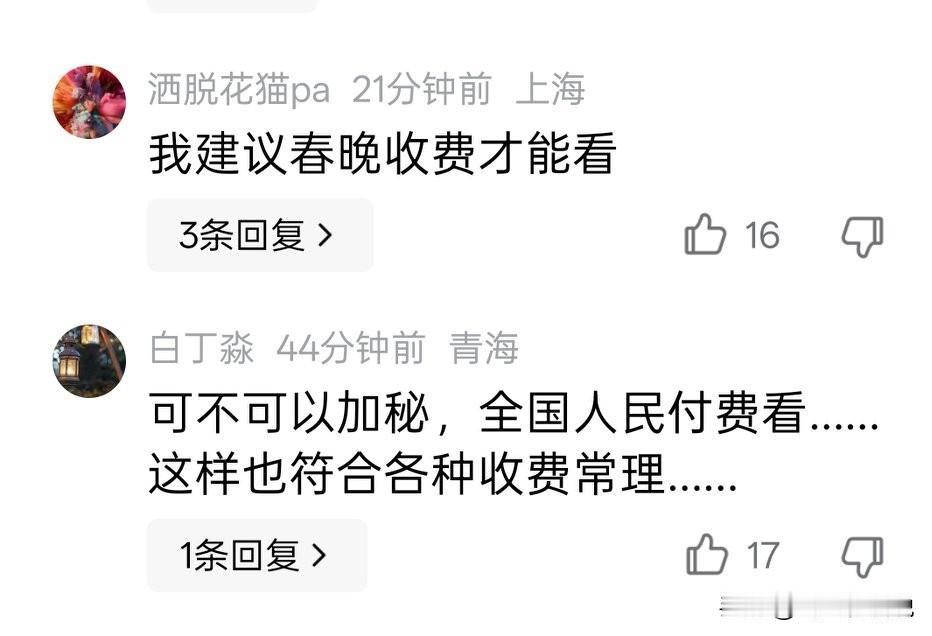 春晚,央视也是花了大本钱的,这也应该是自有知识产权的 不給电视台交钱 ,禁止个人在其它媒体点播、回看、下载等行为,也无可厚非 有投资 ,想多收益一些也属正常 春晚,除了去现场看要花钱之外,在除夕夜让大家免费看,大家就应该深深感谢人家 毕竟,没有春晚的除夕夜,会是多么无聊 大家最好不要忤逆人家,坐在电视前看看就行 看看评论区,春晚应该加密收费才对,这也是看热闹的不嫌事大 这么多年让大家免费看就行了,就应该知足常乐 最好不要干那些违法的事了