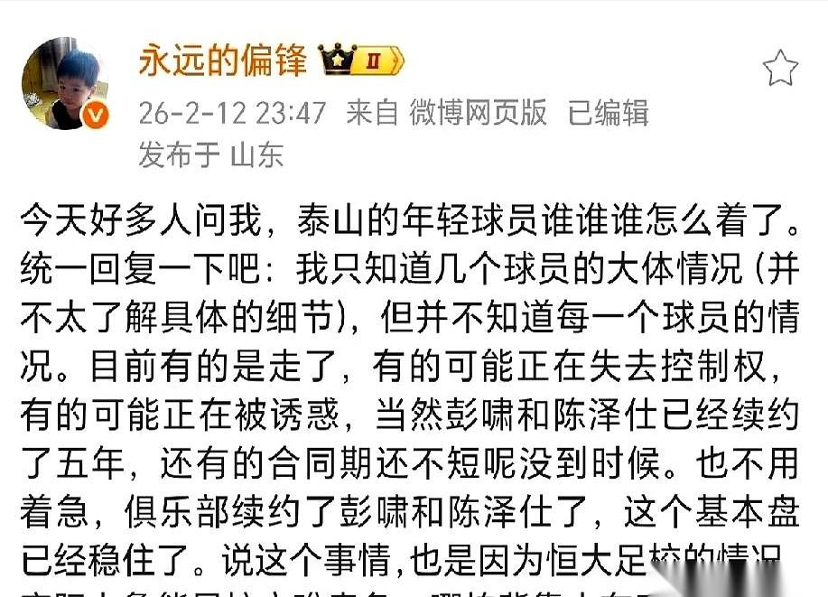 辛辛苦苦养大的孩子,还没等穿上咱家的大衣裳,就被人三瓜俩枣地领走了。 你啥感觉? 憋屈,真他妈的憋屈。 当年的韦世豪就是这么一根刺,扎在心里好多年。现在这根刺,可能要变成一把接一把的刀子了。 以前好歹还有个规矩,在我这儿练出来的,根就在这儿,我先签。现在这规矩没了,等于说咱家的篱笆破了个大洞,谁都能来地里拔萝卜。人家给个万儿八千的签字费,孩子一激动,脑子一热,打包就走了。 咱这边呢?十年青训,教练、场地、吃喝拉撒,那投进去的都是真金白银和心血啊。 最后呢?为他人作嫁衣裳。 所以啊,泰山队这帮人也不傻,一合计,与其天天防贼,不如自己把路给铺好。 怎么铺?让B队去冲甲。 你琢磨琢磨这招,多绝。 小球员想踢更高级别的比赛?好,咱家B队就是中甲平台,够不够你踢?别的队挖你,最多也就是去个中甲中乙,在我这儿一样踢,头顶上还有中超的一线队随时盯着你,是金子早晚发光。 这不就堵上了吗? 这不是什么高深的战略,这就是被逼出来的生存智慧。 说白了,种树的不摘果,这活儿谁还愿意干?得想办法让果子,能落回自家的篮子里。