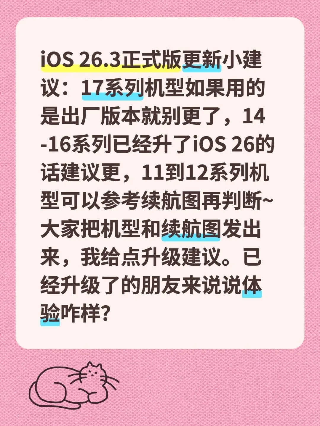 ios26.3升级建议,在乎续航的谨慎。iOS 26.3正式版更新小建议:17系列机型如果用的是出厂版本就别更了,14-16系列已经升了iOS 26的话建议更,11到12系列机型可以参考续航图再判断~大家把机型和续航图发出来,我给点升级建议。已经升级了的朋友来说说体验咋样?