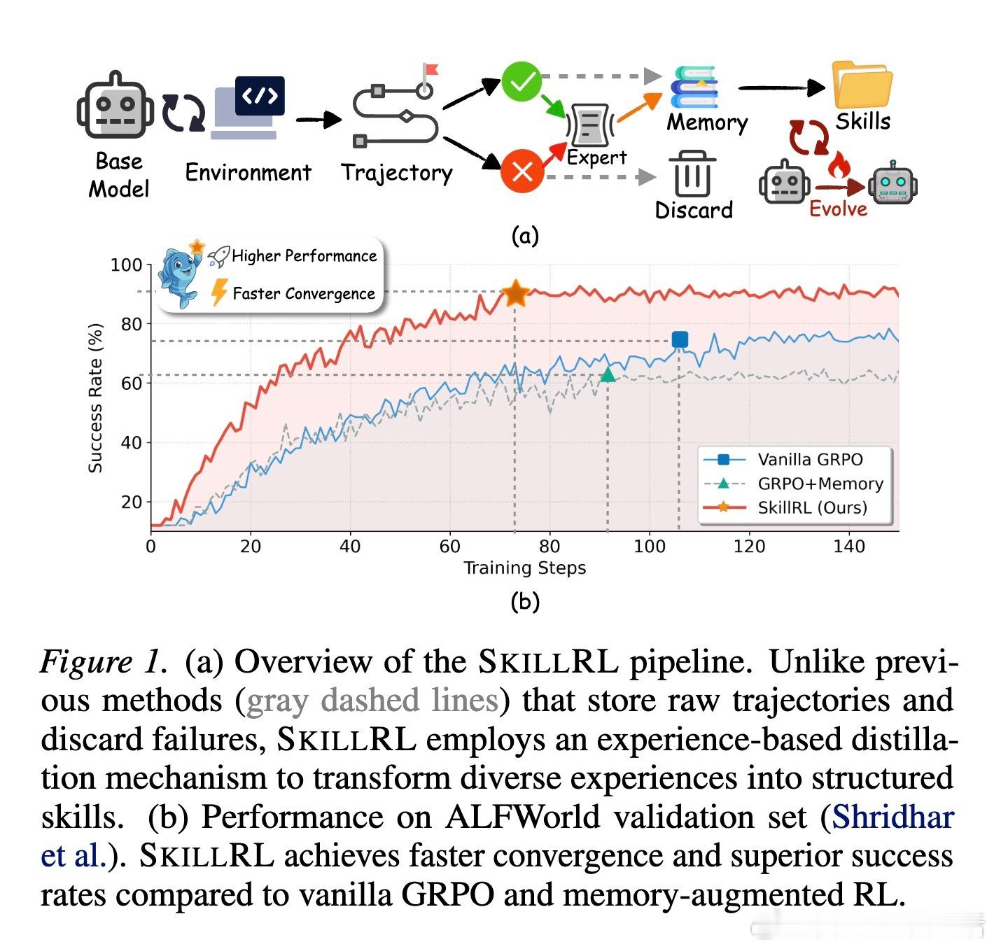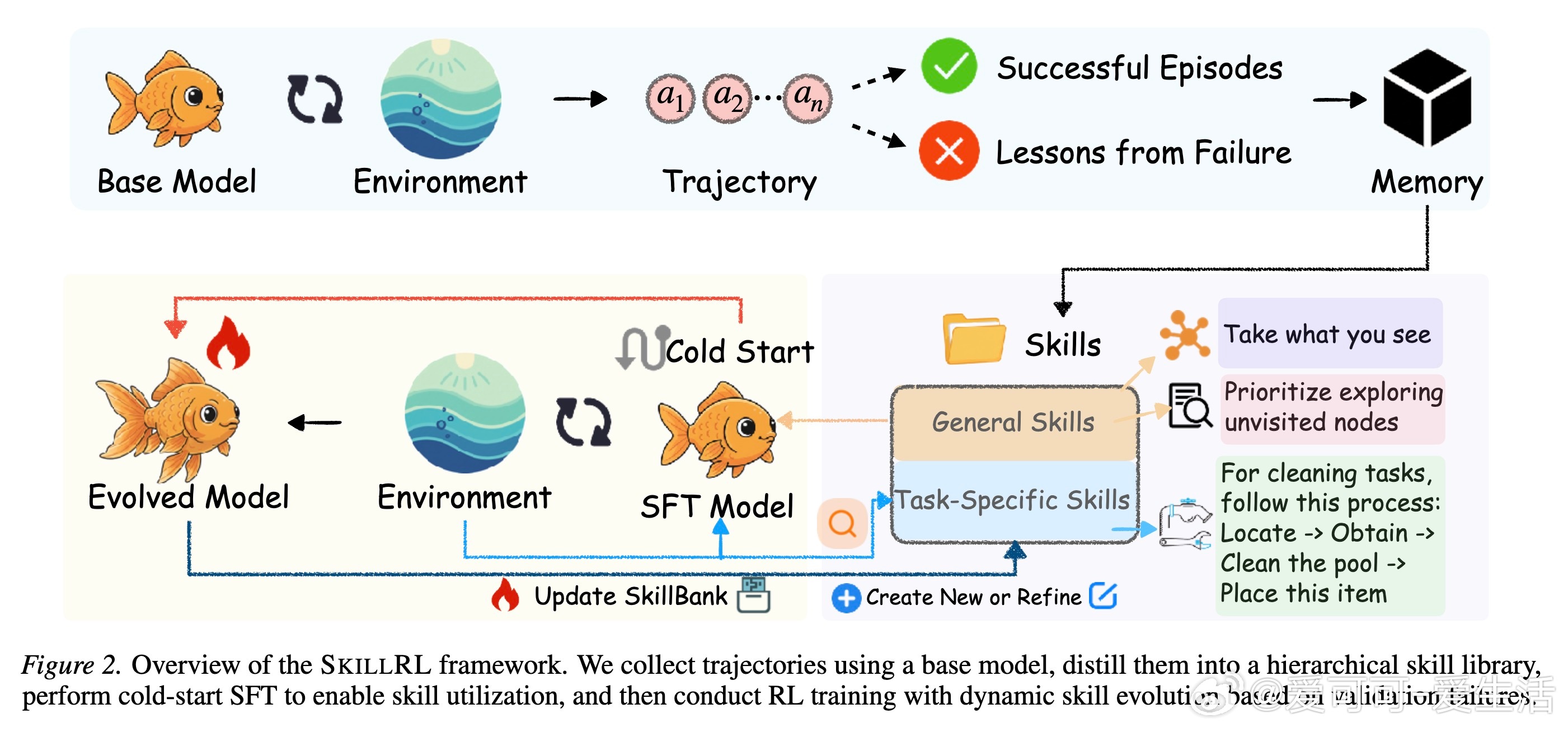 为了解决基础模型不会使用技能的问题,SkillRL设计了冷启动监督微调阶段。通过教师模型生成的推理轨迹,教会智能体如何检索、理解并应用这些抽象技能。随后,利用GRPO算法进行强化学习,在保持技能利用能力的同时,最大化任务成功率。