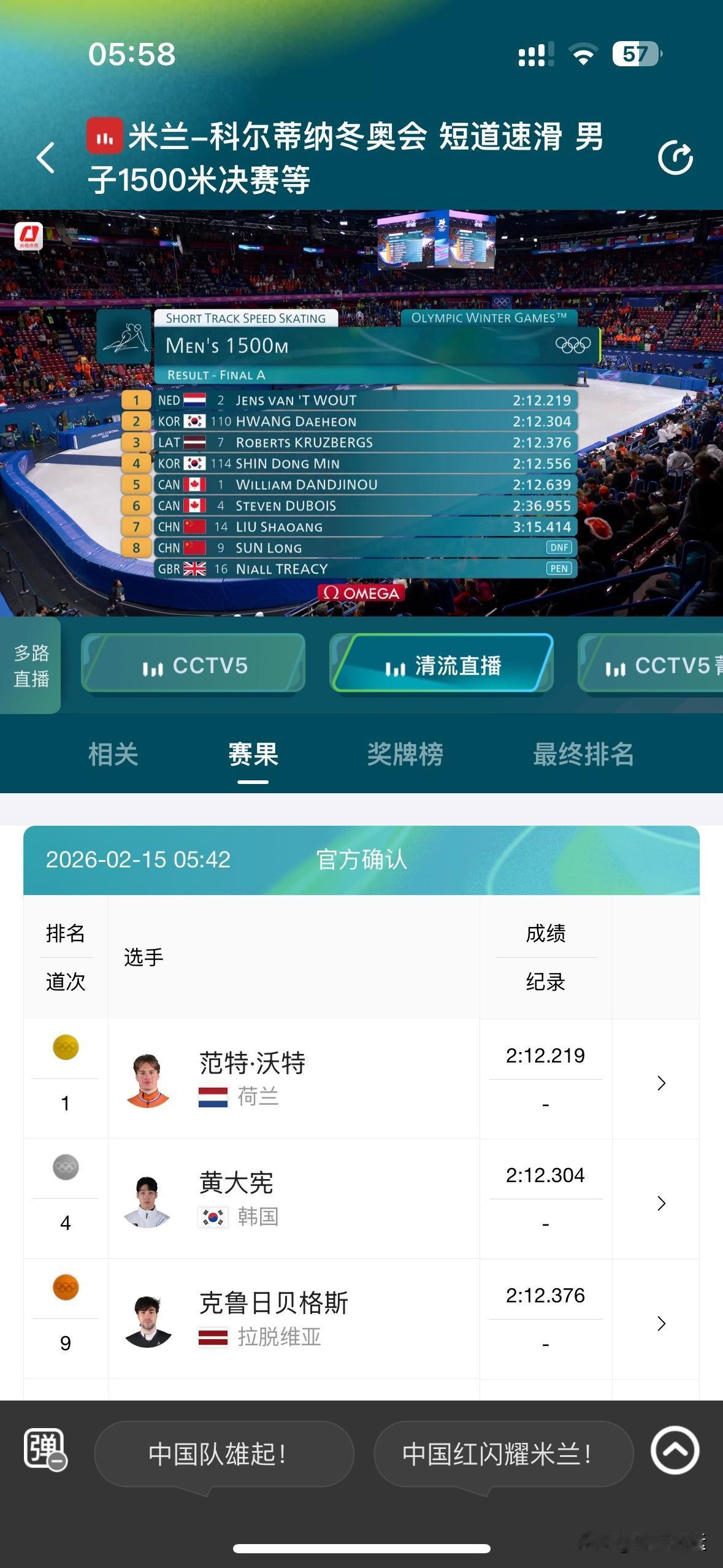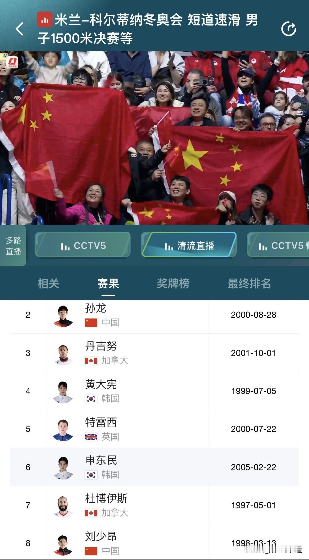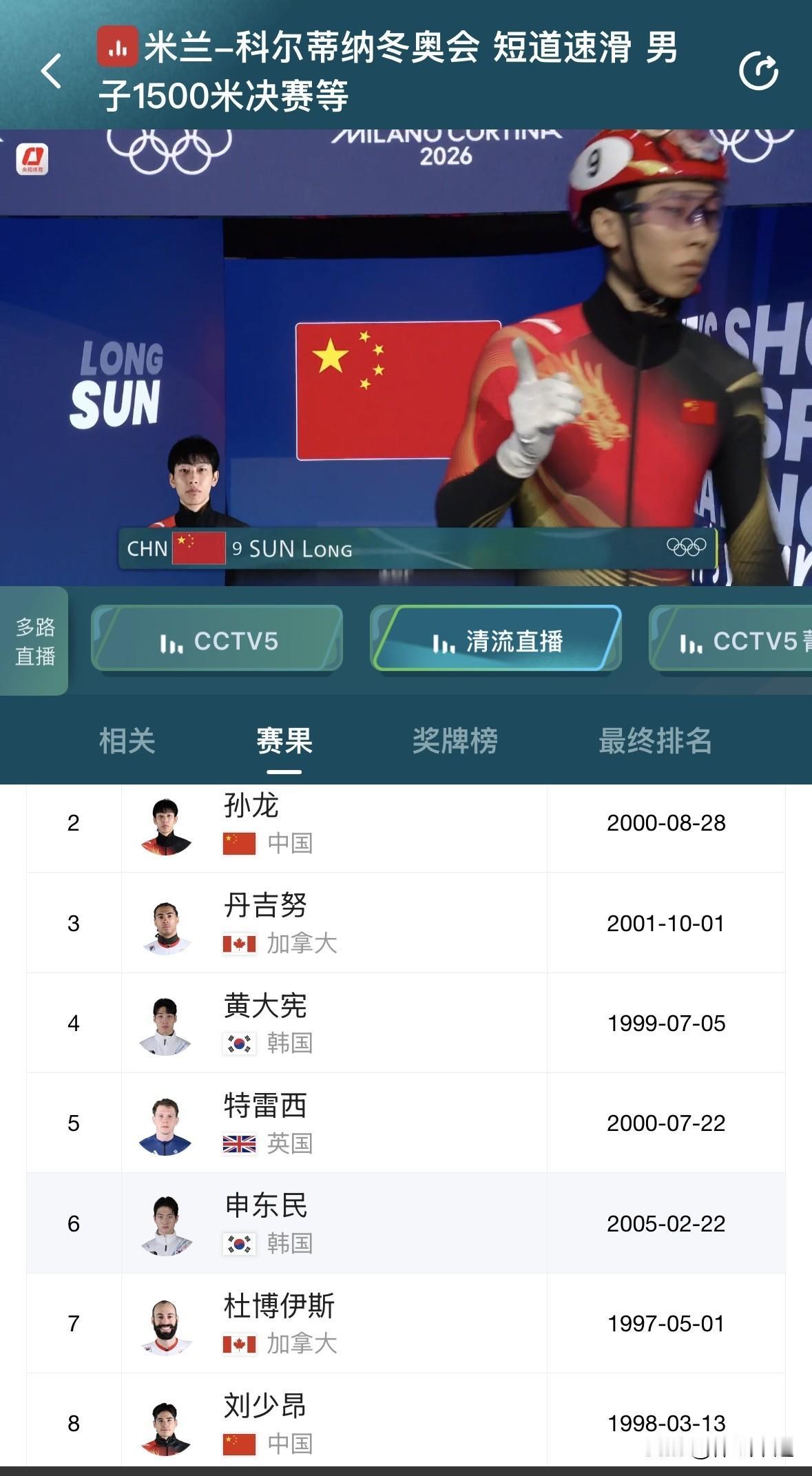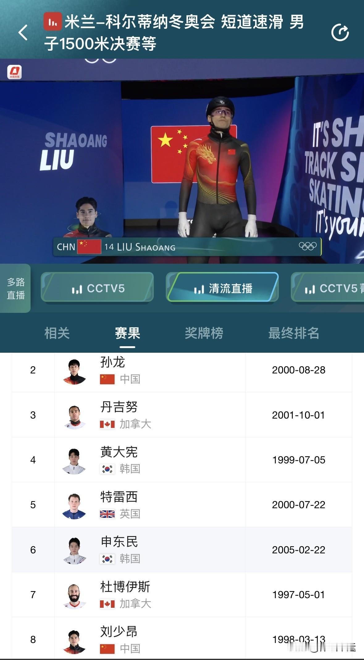 意外被干扰,刘少昂·孙龙双双摔跤无缘奖牌[捂脸][捂脸] 米兰冬奥会短道速滑男子1500米比赛真是让人意难平。1/4决赛时,刘少昂以2:23.370的成绩排名第二晋级,孙龙也以2:20.897第三的成绩晋级,可惜林孝埈摔倒出局。 到了决赛,本以为刘少昂和孙龙能冲一冲奖牌,结果被英国选手干扰,两人双双滑倒。荷兰选手范特沃特以2:12.21的成绩夺金,英国选手特雷西还被判犯规无成绩。最终刘少昂只排到第七,孙龙更是没完成比赛排第八。心疼这两位选手,希望他们之后能有更好的表现。
