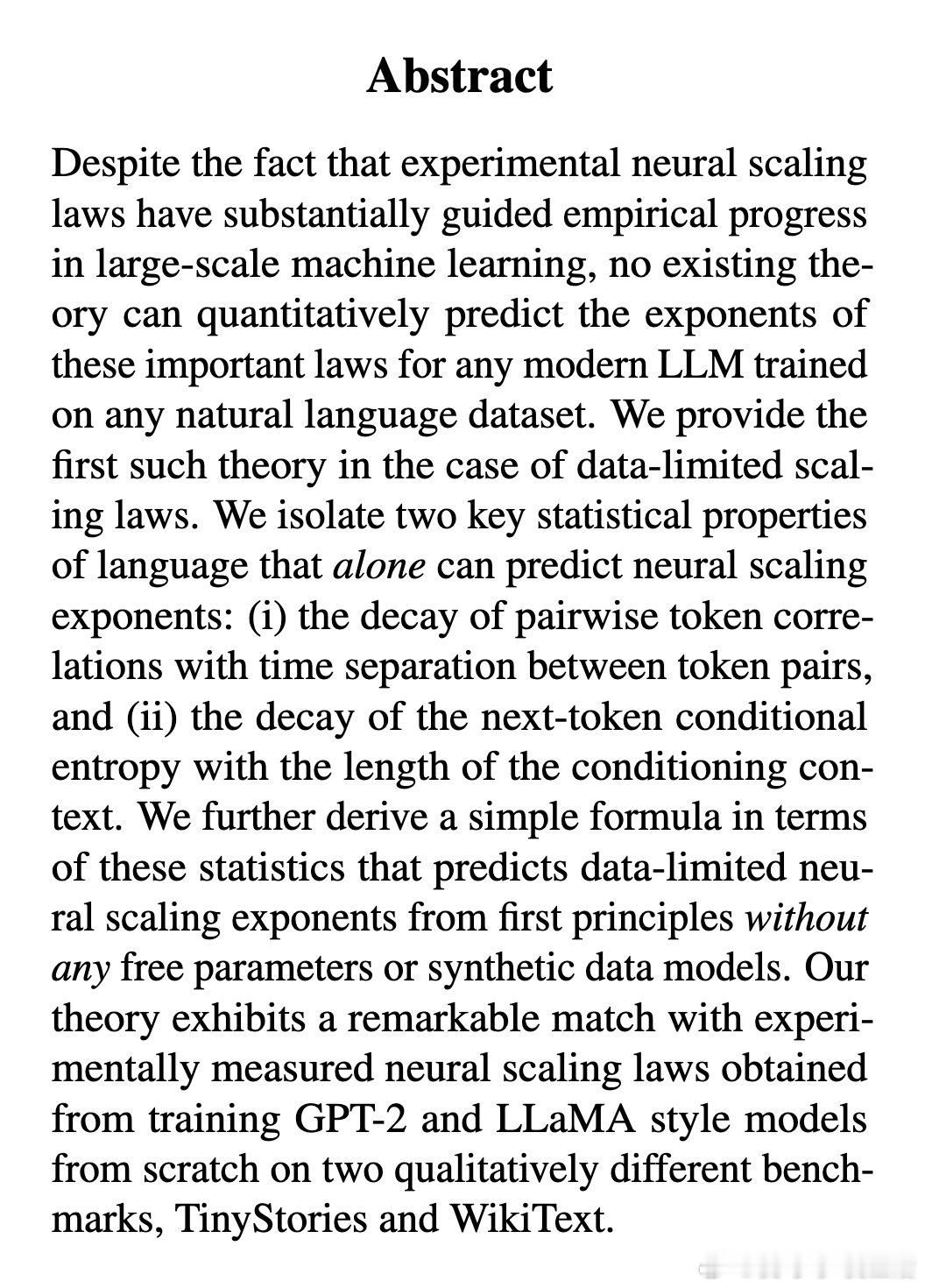 长期以来,缩放法则(Scaling Laws)更像是一个经验公式,而非严谨的物理定律。最近,来自Francesco Cagnetta和Surya Ganguli等学者的研究,首次从语言统计学的“第一性原理”出发,推导出了神经网络的缩放指数。