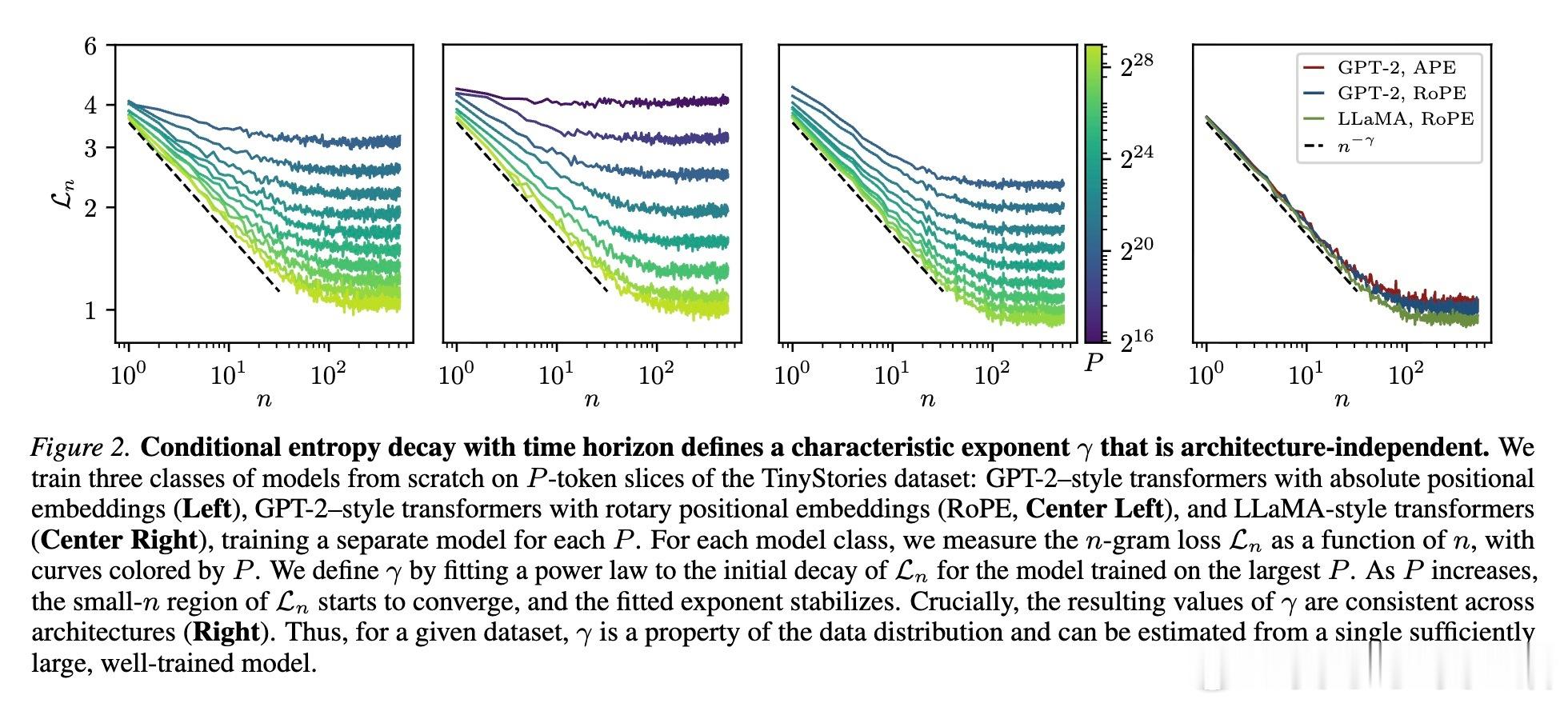 当你把不同上下文长度下的学习曲线,按照理论推导的比例进行缩放后,所有杂乱无章的曲线竟然重合在了一起,形成了一条完美的“母曲线”。这意味着,无论模型是在学习短距离的语法还是长距离的逻辑,它们遵循的底层逻辑是完全统一的。