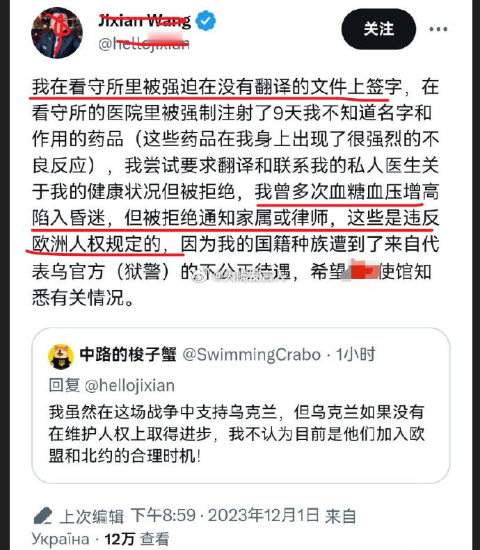 乌克兰刑满释放罪犯、想当乌克兰人的这位前华人,现在比乌克兰官员还爱乌克兰乌克兰官员说没有证明证明中国向乌克兰供应了武器,这位乌克兰华人刑满释放犯,就开始对乌克兰官员阴阳怪气了,并提到向大陆投诚的湾湾馆长所谓好的伤疤忘了疼,就是这类货。跑到乌克兰,去爱一个在欧洲腐败排行榜上领先的国家,脑子不是一般人图6是王吉贤自称被乌克兰监狱注射了不知名的药品,此时,他想向我国大使馆求助热点观点 ,乌克兰 ,俄罗斯乌克兰