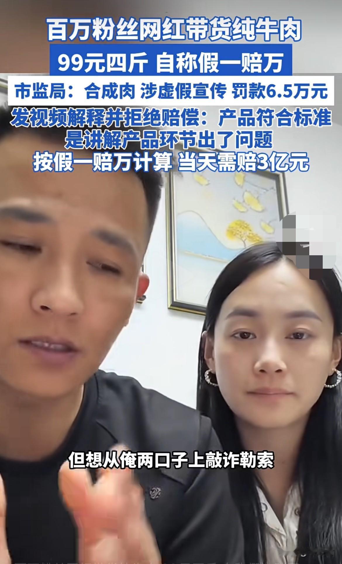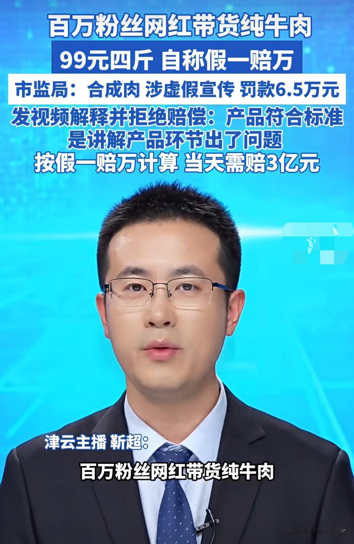 百万粉丝网红“帝货纯牛肉”,直播间卖99元四斤的牛肉卷,还信誓旦旦喊出假一赔万。结果呢,有消费者买回家发现配料表根本不是纯牛肉,全是科技与狠活,经过一查,确定这就是合成牛肉,属于虚假宣传,罚了6.5万。可按“假一赔万”算,当天要赔3亿呢。顾客找他赔偿,他还拒绝,说产品符合标准,只是讲解环节出问题。这不是睁眼说瞎话吗?为了赚钱,一点诚信都不要了,真让人失望。