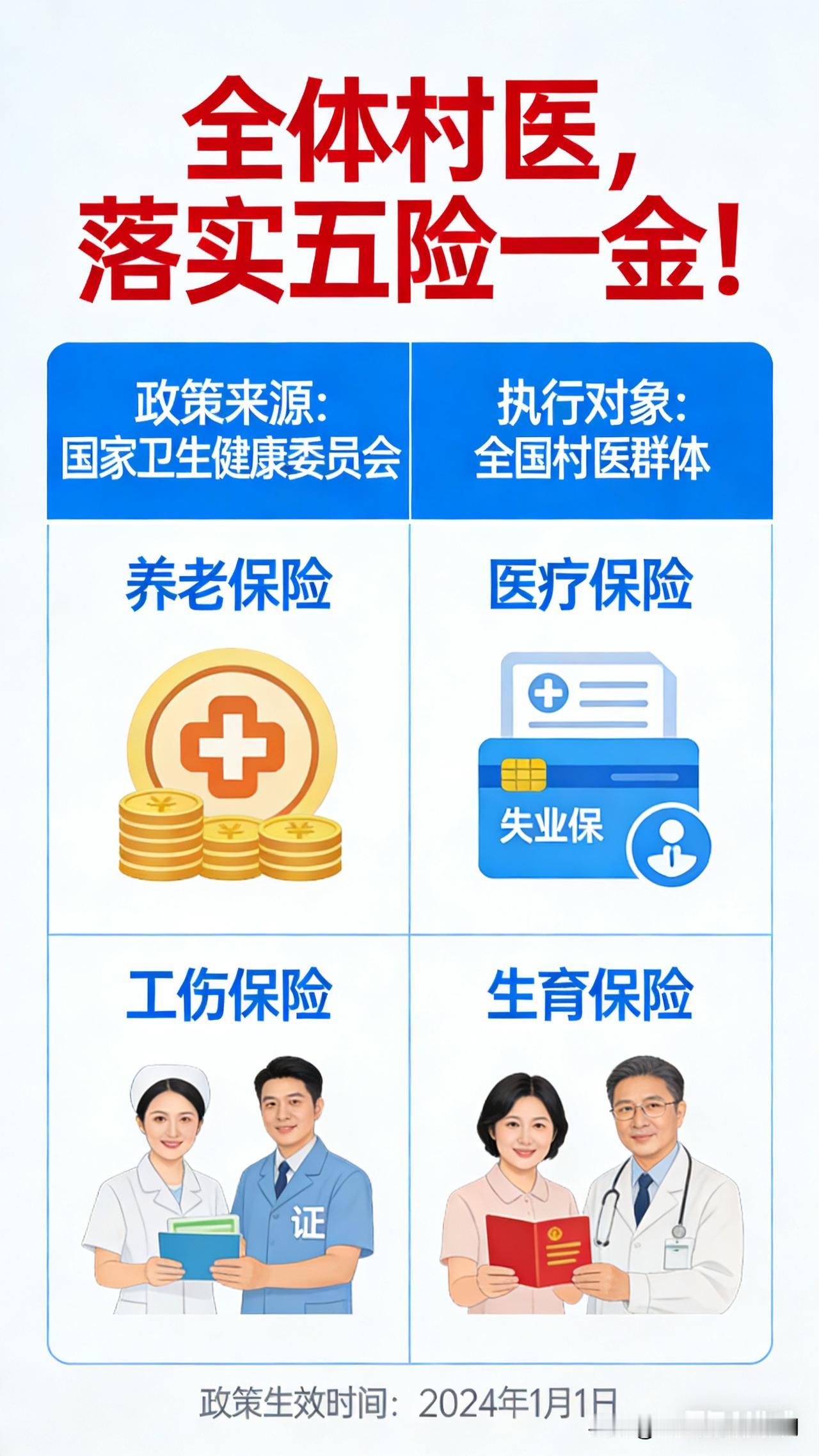 一、政策核心:村医五险一金,国家定调、地方落地 国家层面(2023年中办国办《关于进一步深化改革促进乡村医疗卫生体系健康发展的意见》)明确: - 入编村医:参加机关事业单位养老、职工医保等,五险一金全覆盖 - 未入编村医:参加企业职工养老/城乡居民养老、职工医保/城乡居民医保,有条件地区财政补助 2026年多地卫健委/政府发文,全面推进“乡聘村用”: - 村医与乡镇卫生院签劳动合同,按职工标准缴五险一金(养老、医疗、失业、工伤、生育+公积金) - 财政承担单位缴费部分,个人仅缴个人部分 二、2026年地方落地要点(已明确地区) - 福建:乡聘村用村医为卫生院合同制,五险一金+基本工资+年薪制;财政补贴职工养老(如福州60%、泉州年补≥3000元) - 甘肃:为村医买企业职工养老+医疗责任险;执业10年+45岁以下+执业医师+群众认可,可直接入编 - 江苏南通:执业满6年的执业(助理)医师可入编;同工同酬、落实五险一金 - 贵州:2026年村医劳动合同应签尽签、全员参保;月均收入不低于3000元 - 安徽/四川:大学生村医专项计划优先入编,入编后五险一金全额缴纳,月入显著提升 三、关键变化与影响 - 身份转变:从“半农半医”→卫生院合同/编制职工,“单位人”保障 - 收入提升:基础工资+绩效+五险一金,月入普遍翻倍(如安徽入编村医从2000→5000+) - 养老兜底:60岁以上离岗村医提高养老补助(如厦门每月800元) 四、你能享受吗?(快速判断) 1. 是否纳入乡聘村用/县管乡用管理(与乡镇卫生院签合同) 2. 是否取得乡村医生证/执业(助理)医师证 3. 当地是否已出台村医五险一金实施细则 需要我帮你整理一份村医五险一金办理流程和所需材料清单吗?