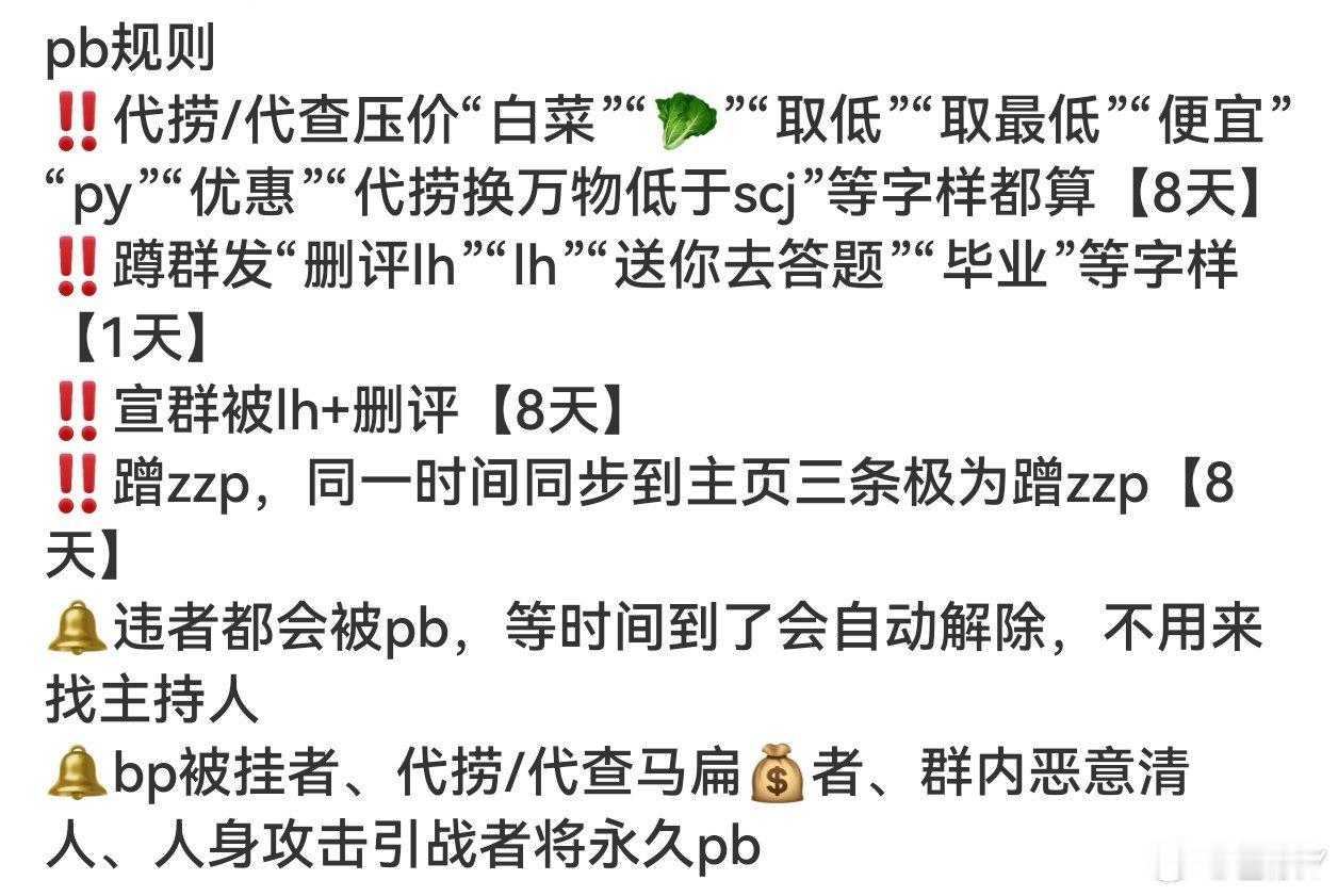 ⁉️问题答疑帖(1):为什么我发帖要审核答:凡是七天之内被pb过的解除之后发帖都会审核,过几天就好了(2):我为什么被pb了答:凡是近期被pb的请查收一下ch社区的提醒(见图一)(3):提示我被pb一天,时间到了为什么还不解除答:小主持人只能pb一天,后面大主持会改时间,请按照原因了解pb天数(见图二)(4):被群内当成bp挂h了能解吗答:谁挂的你你去找谁解释去,她/他要是给你解让她/他来找主持,不给你解就解不了(5):很早之前不知道什么原因被bp但是现在在ch搜不到自己名字怎么解答:23年之前不管什么原因pb都是永久的,直接找主持解就行;23年之后搜不到名字多半是被挂h pb的,帖子被删了那就解不了(6):群不在了能解吗答:不能,群或者帖子不在了无解 ⚠️⚠️⚠️注:私人恩怨自行私下解决,zcr不插手