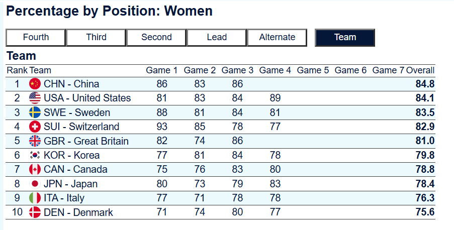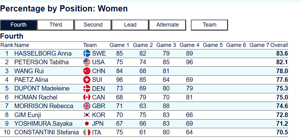 【奥运冰壶】中国女队第四个对手是美国队(北京时间2月15日21:05),这次奥运,美国女队的代表是Peterson队,Peterson是刘斯佳时代的运动员,36岁,与王冰玉队都有过多次交手,在美国队打过一垒、三垒和四垒,在北京周期成为美国四垒&Skip。她有三次奥运经历:米兰、北京(四垒&Skip)、平昌(三垒),这与芮姐的三次奥运经历类似。Peterson队与中国雨芮队的H2H是2-2,其中2021世锦赛和北京奥运胜中国(雨队),2025泛大陆和世锦赛负中国(芮队)。美国队三垒是Thiesse Cory,这是在奥运混双出场过的运动员,已经收获一枚混双银牌。二垒是Peterson Tara,是四垒的妹妹,是第二次参加奥运会女子比赛,上一次奥运她担任一垒。不仅Peterson队与中国雨芮队的H2H相近,中国美国的冬奥羁绊也很深:美国队一向不是实力最顶尖的那几队,但几乎每次我们都打得异常艰难,奥运会上的总战绩也是2胜2负,2010温哥华和2014索契都拿下了美国,2018平昌和2022北京负美国。目前,美国队成功率仅次于中国(图一),四垒Peterson状态也调动很好,排名四垒第二(图二),仅次于博格,两队在今晚将会展开一场精彩大战。