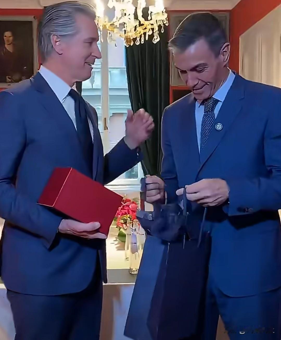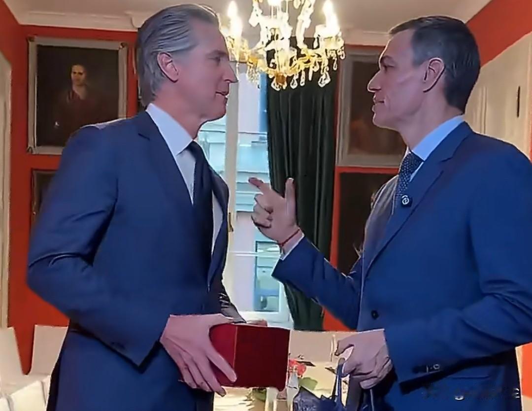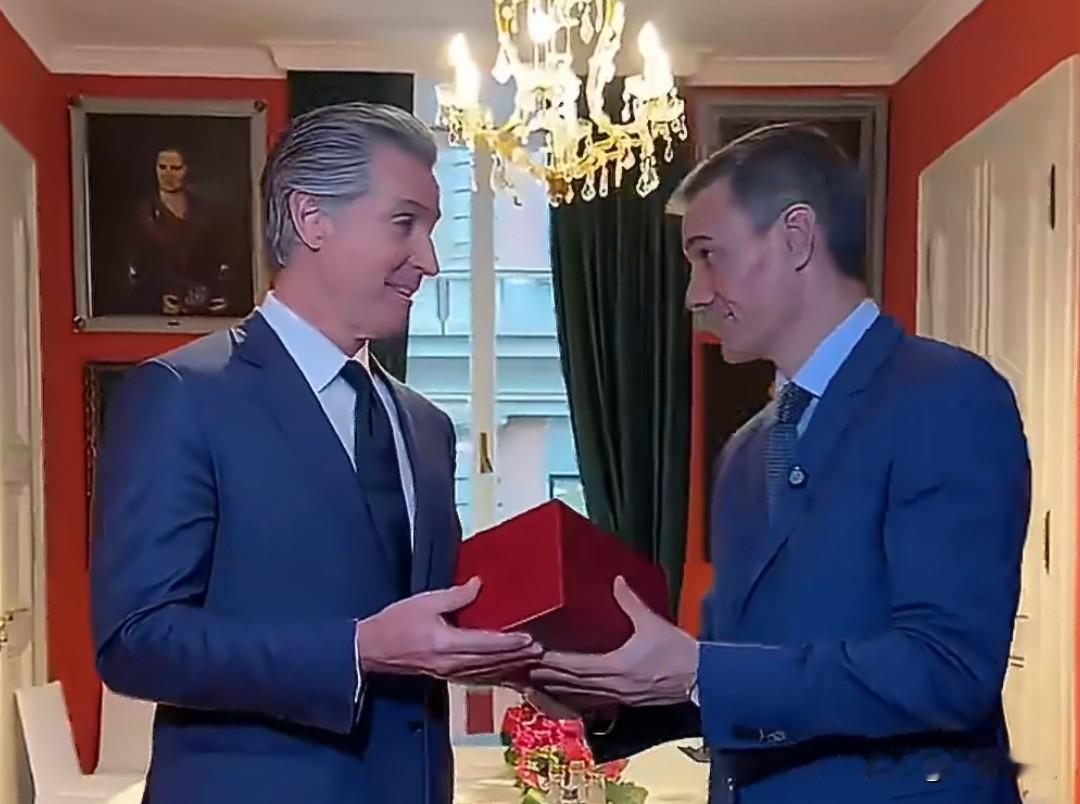 西班牙首相桑切斯与加州州长加文·纽森在慕尼黑互赠礼物,桑切斯感谢纽森捍卫多边主义与进步价值观。