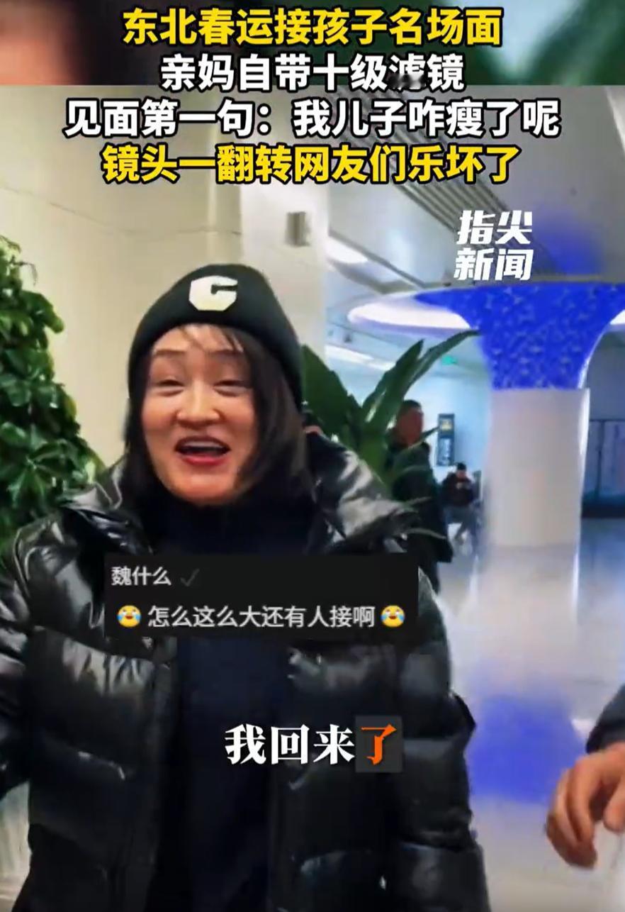 这一看就是亲妈!黑龙江哈尔滨,男子过年回家,父母在机场接机时,看到儿子第一句话就是:哎呀,我儿子咋瘦了!结果这一句话,直接把男子给说脸红了,镜头一转,大胖脸把网友都笑翻了 过年回家,父母去机场接他。他寻思着好久没见爸妈了,这回得把这一幕录下来留个纪念。手机掏出来,镜头对着自己,边走边想,等会儿老妈第一句话会说啥?大概就是那种想你想坏了、路上累不累之类的吧 结果呢,老妈一见他,脱口而出:哎呀,我儿子咋瘦了!就这一句话,把他整不会了 要知道,他本来就不瘦,这一年还胖了二十多斤,脸都圆了两圈。他自己都说,要说累了、老了,这都能理解,但瘦了这俩字,确实有点睁眼说瞎话的意思了。当场就不好意思了,脸红得不行 这事看着是个乐子,仔细想想,里头有点东西。什么叫亲妈滤镜?这就是 在当妈的眼里,不管你长成啥样,只要你没在她跟前待着,那就一定是吃不好、睡不好、受委屈了。你胖了,那是她自己喂得好;你瘦了,那是在外面遭罪了。反正横竖都是她有理,横竖都是她心疼你 男子胖了二十多斤,脸都大两圈了,他妈愣是没看出来,或者说,看出来也不承认。在她那儿,儿子永远是那个需要她照顾的小孩,永远是那个在外面吃不饱饭的可怜孩子。这就是当妈的逻辑,不讲道理,但特别真实 评论区有人说,这不叫瞎说,这叫母爱滤镜,厚得能挡子弹 想想也是,小时候嫌爸妈唠叨,嫌他们管得多,嫌他们老觉得自己啥也不会。长大了才发现,这世上能这么没道理地疼你的人,也就那么两个 他们不是看不出来你胖了,是他们不愿意往那方面想。在他们心里,你不在家的日子,就是受苦的日子。你回来了,他们才算放心 过年回家,爸妈说你瘦了,你就顺着他们说。别反驳,别解释,多吃两口他们做的饭,比啥都强