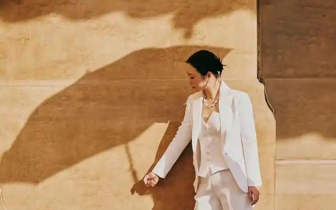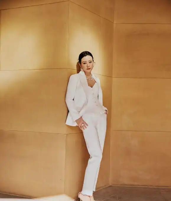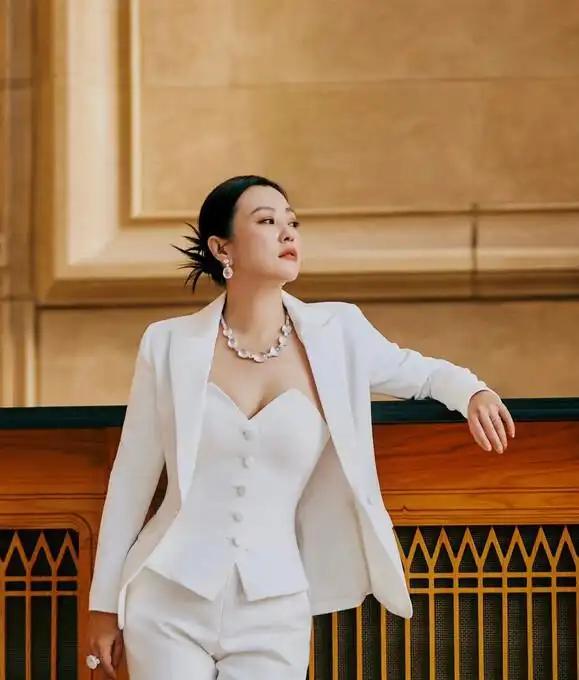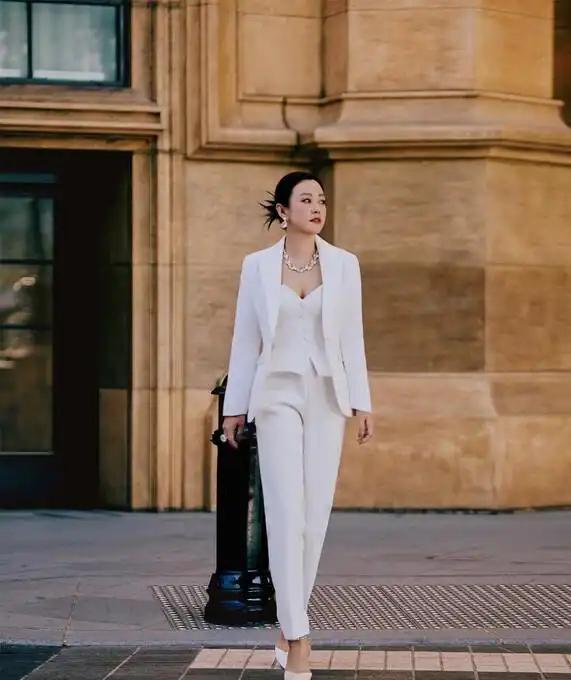 郝蕾的这般造型,不仅其外套存在一个带有收腰效果的小弧度从而显得更为修身,而且里面还搭配了一件紧身抹胸,这种搭配打破了传统的衬衫内衬样式,抹胸上凸起的口子既是一种设计,同时也是一种层次感体现。鉴于穿抹胸时脖子部位会显得太过单调,所以项链的设计便可稍微繁琐一些,再加之白色本身就较为简约,如此大颗的水晶更能够对一身白色的单调之感予以弥补。