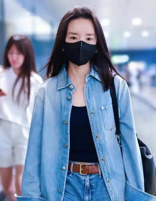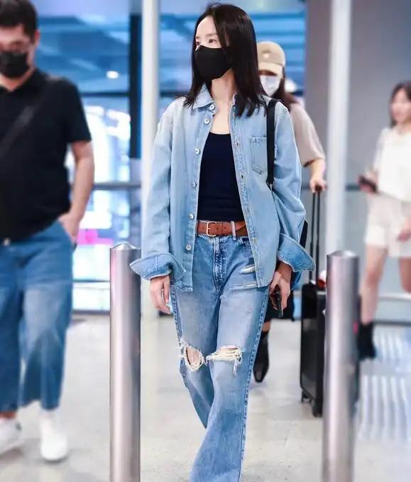 董洁身上穿着的那套套装,其款式呈现出的质感清爽且利落,经过做旧处理的牛仔蓝颜色,超级显白,穿上后立刻就具有很高的高级感。上半身的牛仔外套版型较为宽松,仍旧保留着极为强烈的松弛感,下半身倘若此时依旧搭配牛仔裤,难免会显得有些单调,而破洞的款式更具透气轻盈之感。