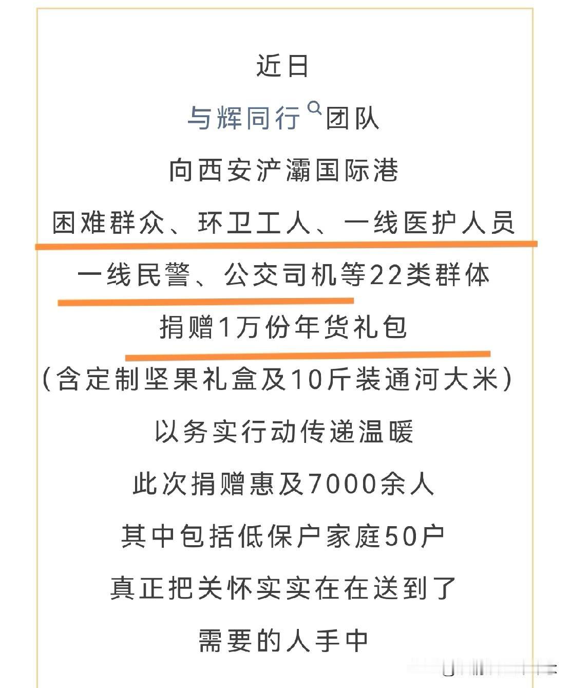 “与辉同行”公益行的脚步还未停止, 宇辉又向西安浐灞国际港的22类群体捐赠了一万份新年礼包! 我已经记不清这是“与辉同行”公益行的第几站了,也算不清他到底捐出了多少坚果和大米,唯一确定的是,还会不断有官方报道出新的捐赠信息。 大家发现没,这次“与辉同行”的公益行,所有的信息都是当地官方媒体报道出来的,还有就是受到捐赠的人主动发视频或文字感谢宇辉,之后才有大家口口相传,若不是互联网让善意被看见,宇辉大概率只会安安静静做完这一切,绝不声张。 这样的公益,没有喧嚣,没有造势,覆盖范围广,覆盖人群精准,一看就是提前很久一次次对接,统计,准备物资,把温暖送到最需要的地方。 那些接受物资的大爷大妈,困难群众,福利院里的小孩,或许根本就不知道董宇辉是谁,不知道“与辉同行”是做什么的,但是,他们给了宇辉一个新的名字,叫“好人”!这胜过万千赞美,也能阻挡无数诋毁。