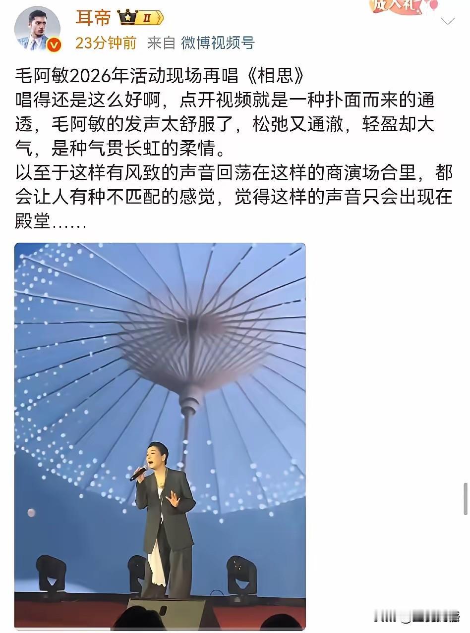 好久没有看到毛阿敏的消息了,也好久没有听到她演唱的歌曲了,也许这些年来,她深入简出,很少公开露面了,但是在2月14日传来了好消息,毛阿敏出现在广东某企业的年会上,再次唱响经典歌曲《相思》,到目前为止,在华语乐坛上,本人最喜欢的两个歌手,一个是王菲,一个是毛阿敏,在我心目中,她们都是具有音乐天赋的,唱起歌来非常省劲,就像说话一样,不像有些人唱起歌来呲牙咧嘴,声嘶力竭!
