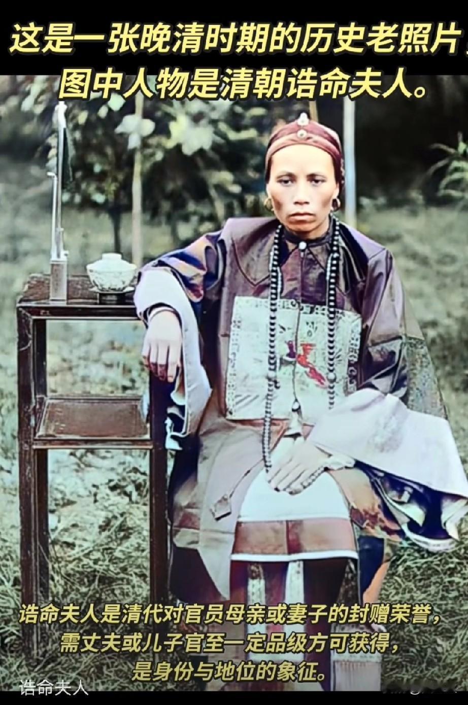 真实的清朝服装难看得很。 这是一张晚清时的历史照片 图中人物是清朝诰命夫人。 诰命夫人是清代官员, 母亲或妻子的封赠荣誉! 需丈夫或儿子, 官至一定品级方可获得。 是身份与地位的象征!