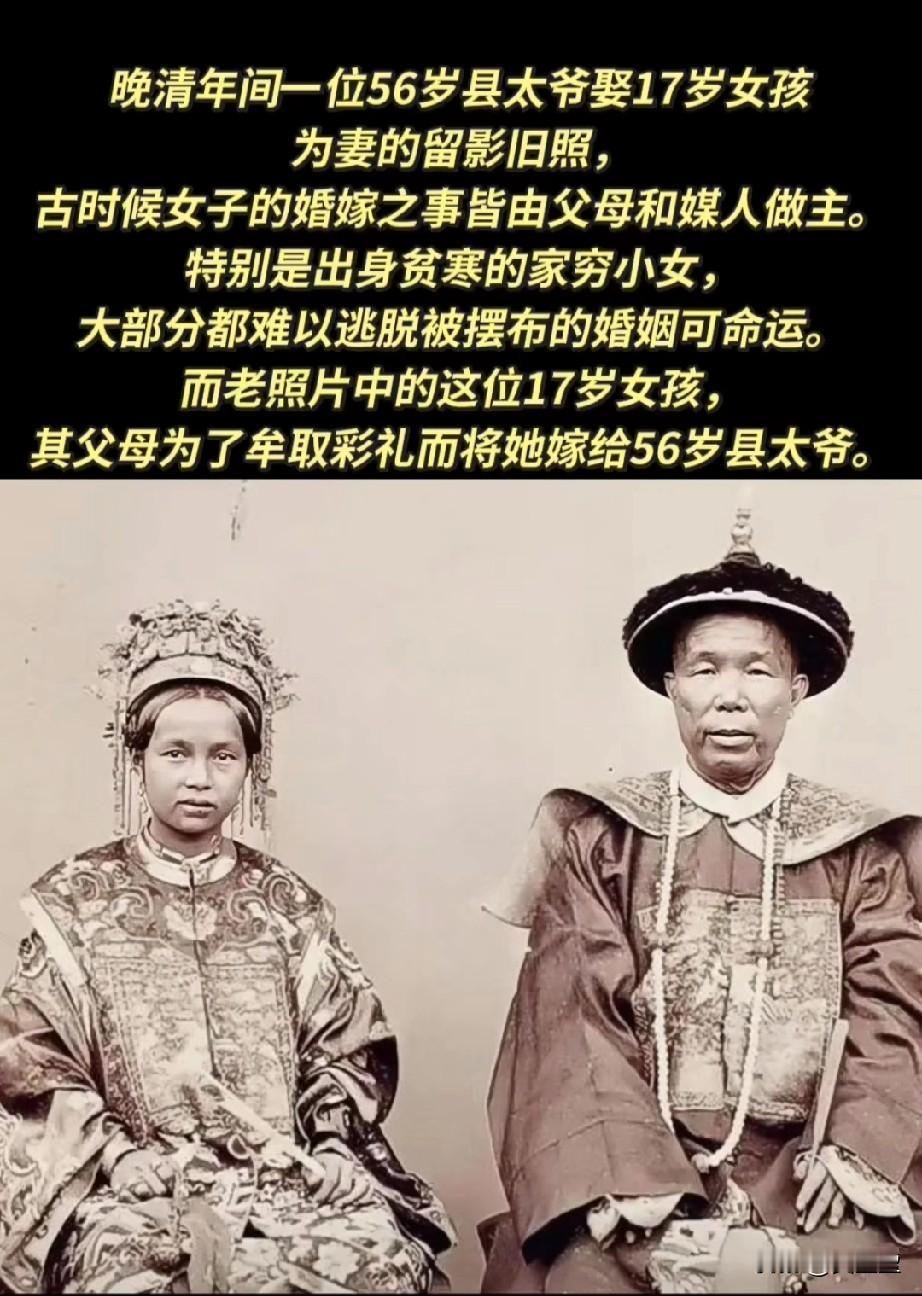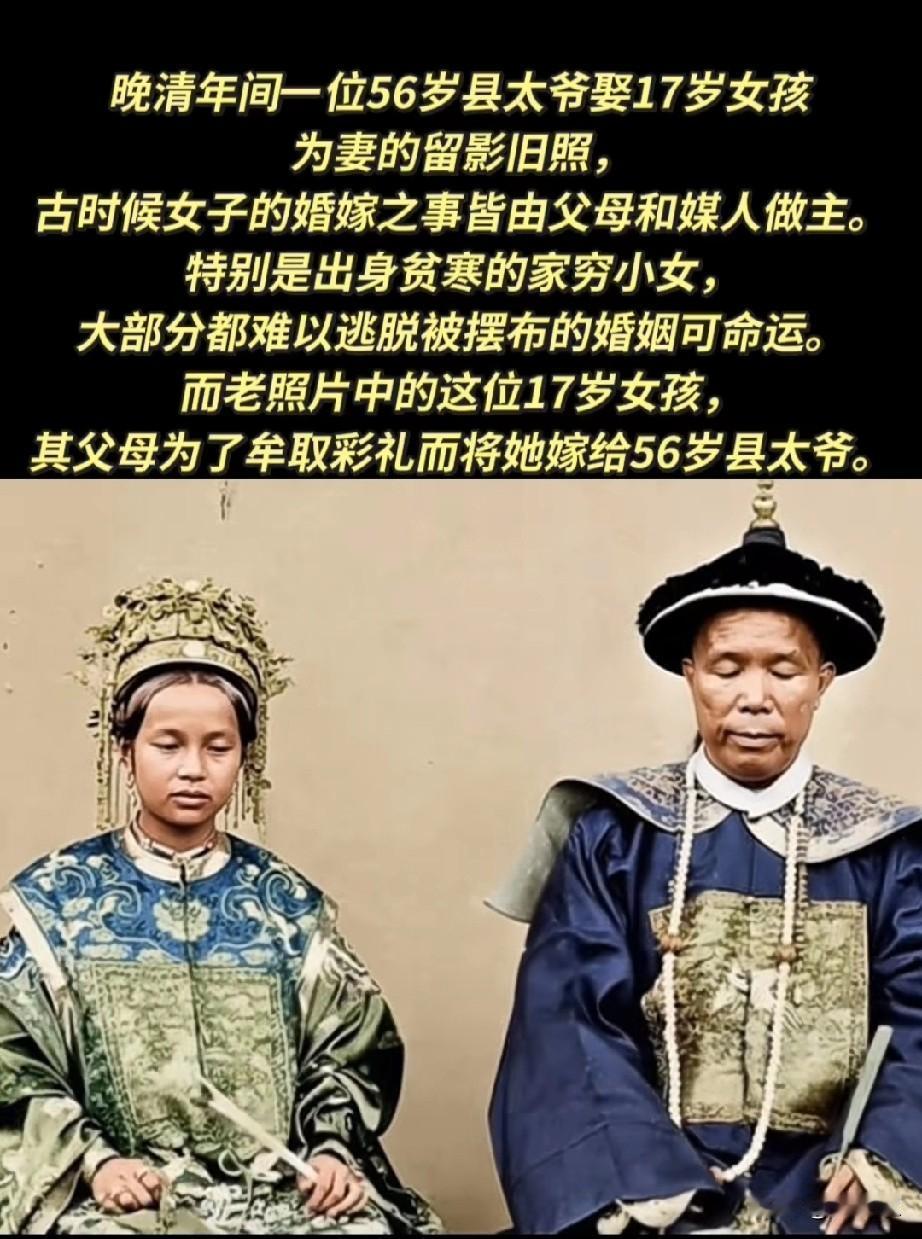 那时候吃都吃不饱! 能嫁县太爷已经很好了! 就现在这年代还不是一样! 哪里来的爱情? 这是晚清年间, 一位56岁的县太爷娶17岁女孩为妻的留影旧照, 古时候女子的婚嫁之事皆有父母和媒人做主,特别是出身贫寒的民家小女,大部分都难以逃脱被摆布的婚姻命运。 而老照片中的这位17岁女孩其父母为了牟取彩礼,而将她嫁给56岁的县太爷。