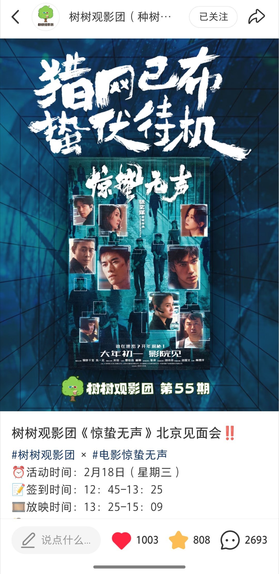 走过路过的朋友们如果看到树树观影团小红书活动评论区里我的评论,就顺手点个赞👍🏻谢谢大家,不强求,能中就去,中不了就不去。如果真中了,去之前可能我爷爷奶奶组合拳打我一顿吧大年初二给张导千玺小花姐拜年去。