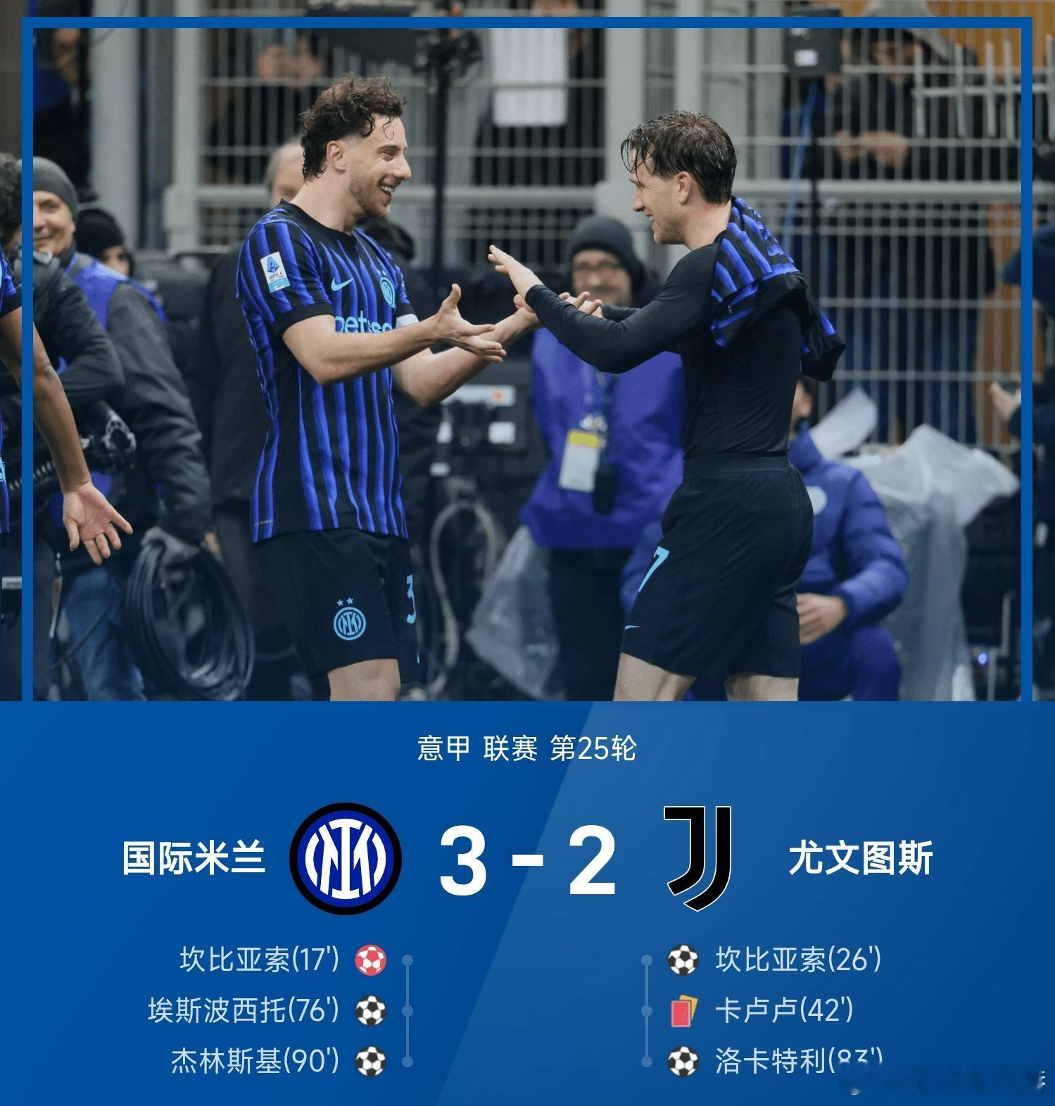 国际米兰3比2尤文图斯意甲每日足球推荐五大联赛 国际米兰3-2战胜尤文图斯。上半场比赛,坎比亚索自摆乌龙后完成破门,卡卢卢领到第二张黄牌被罚下,两队带着1-1的比分进入下半场。易边再战,埃斯波西托第76分钟头球破门,帮助国米2-1再度取得领先,随后洛卡特利破门,少一人作战的尤文2-2扳平比分。第90分钟,杰林斯基世界波破门,帮助国米3-2完成绝杀。