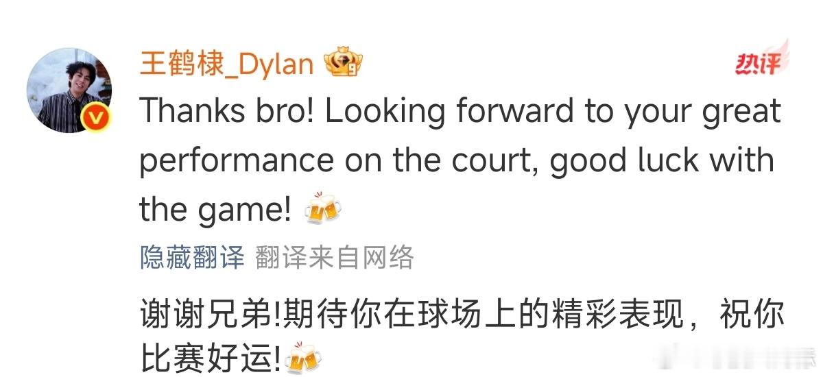 王鹤棣回复霍姆格伦霍姆格伦说王鹤棣看起来很疯狂 王鹤棣回复霍姆格伦:谢谢兄弟!期待你在球场上的精彩表现,祝你比赛好运!