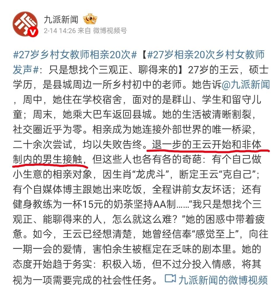 27岁乡村女教师相亲20次你们媒体是怎么能写出这样的小作文的?27岁乡村女教师,相亲20次失败,退一步开始和非体制内的男生接触。好像还挺委屈一样,我都放下身段,和非体制内的男生相亲了,为啥还是找不到对象