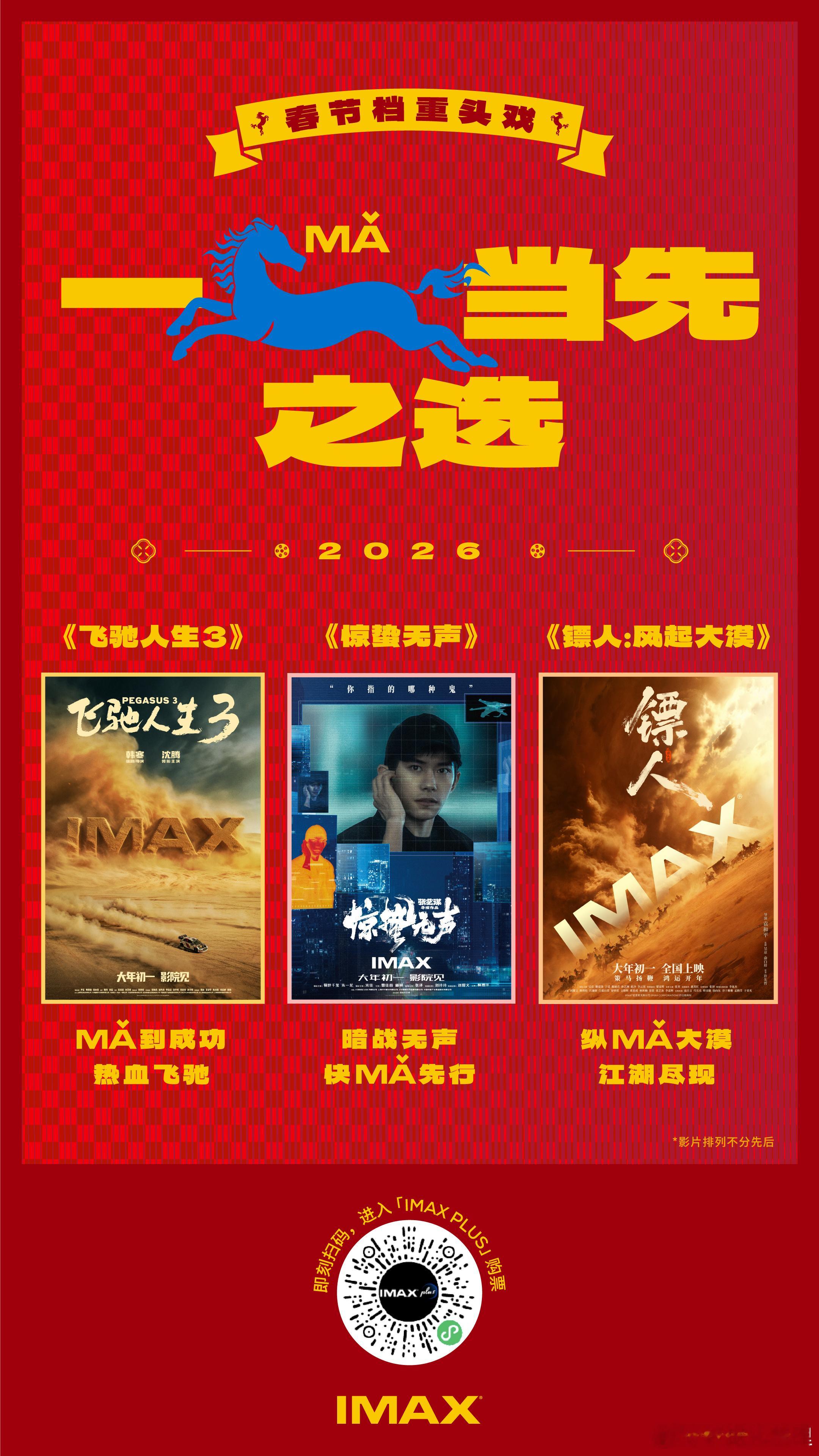 春节档重头戏IMAX一马当先春节档观影决策,用数据说话。今年春节档IMAX三部华语巨制《飞驰人生3》《镖人:风起大漠》《惊蛰无声》预售票房领跑,类型覆盖热血赛车、硬核武侠、高能谍战。