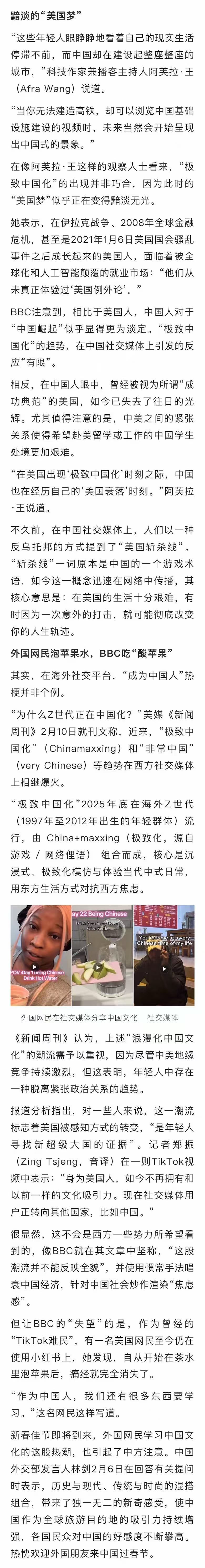 报道称,这股热潮,出现在美国总统特朗普破坏颠覆世界秩序之际。也有人认为,“极致中国化”源于美国年轻人对自己国家的失望。