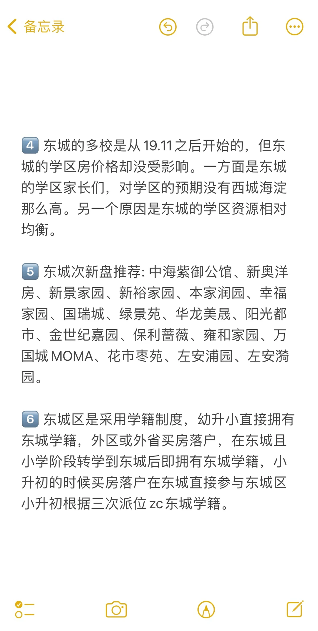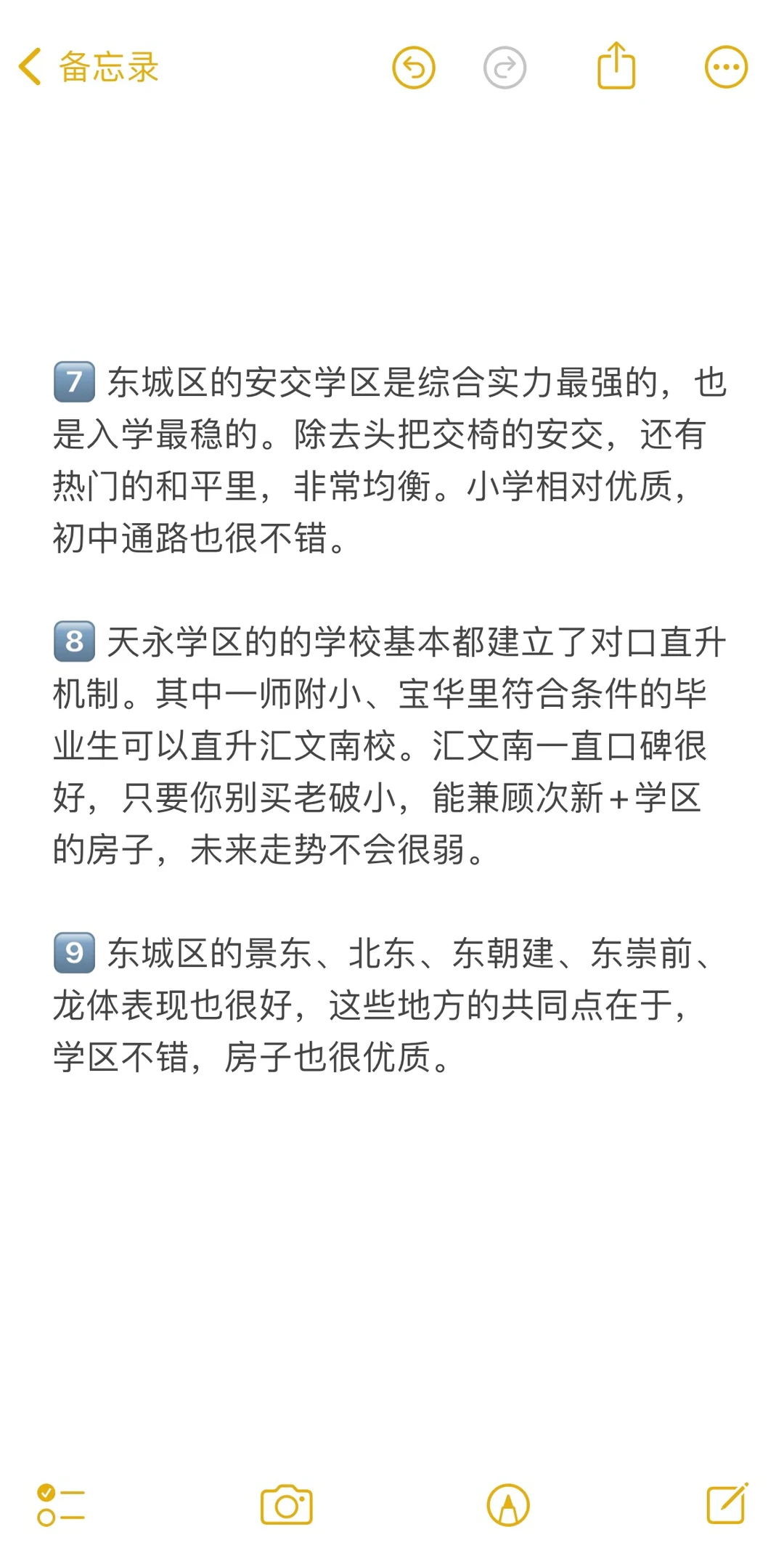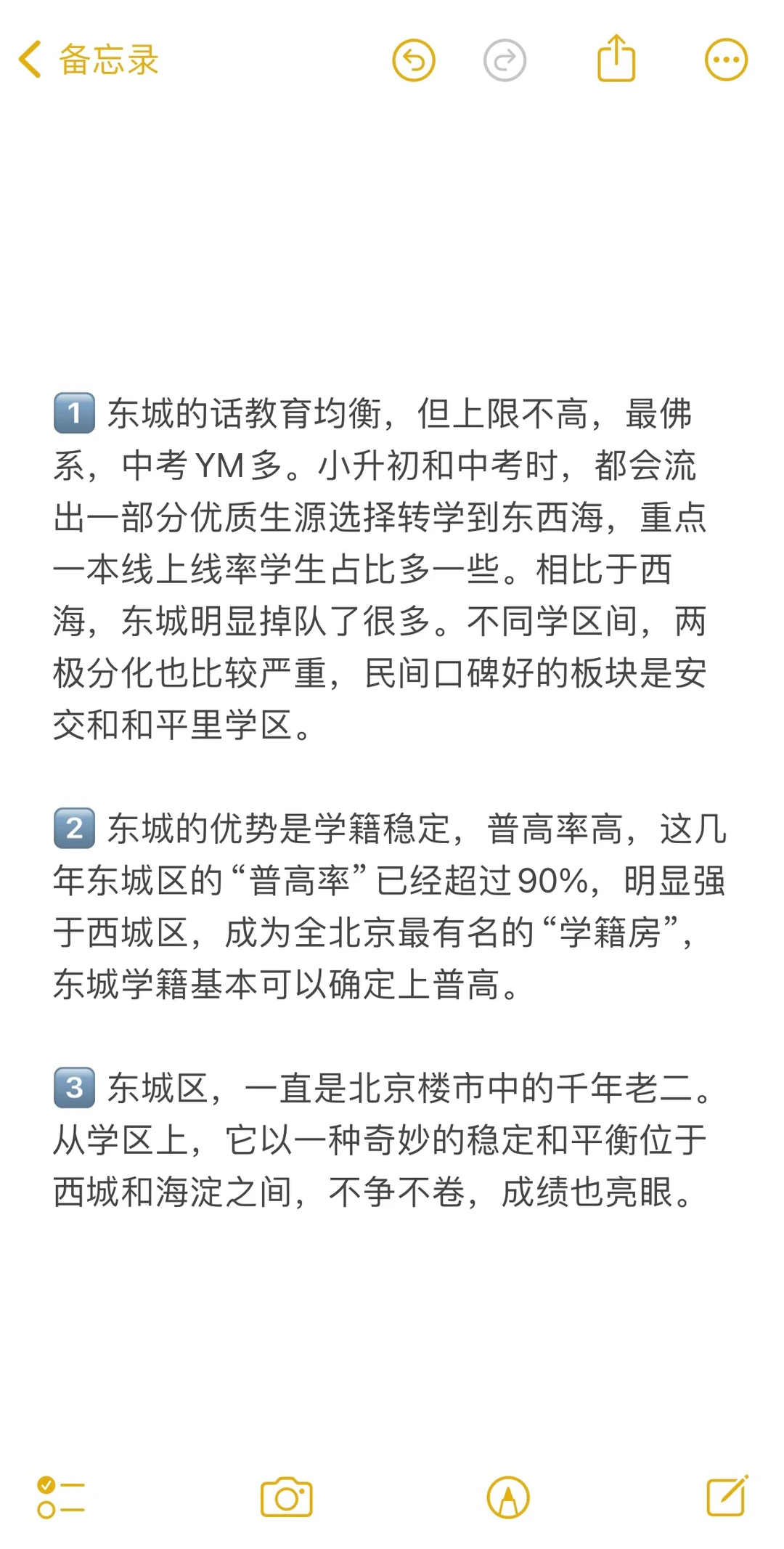 1️⃣ 东城的话教育均衡,但上限不高,最佛系,中考YM多。小升初和中考时,都会流出一部分优质生源选择转学到东西海,重点一本线上线率学生占比多一些。相比于西海,东城明显掉队了很多。不同学区间,两极分化也比较严重,民间口碑好的板块是安交和和平里学区。 2️⃣ 东城的优势是学籍稳定,普高率高,这几年东城区的“普高率”已经超过90%,明显强于西城区,成为全北京最有名的“学籍房”,东城学籍基本可以确定上普高。 3️⃣ 左滑图片,查看更多内容!