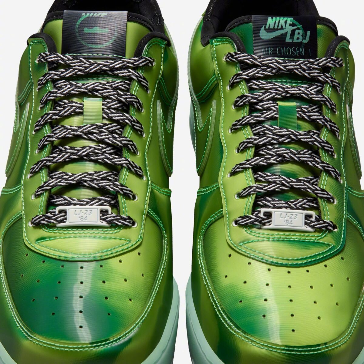 詹姆斯特别版AF1「Voltage Green」配色官图,鞋面为绿色闪卡渐变样式,鞋舌也是「NIKE LBJ AIR CHOSEN 1」和詹姆斯LOGO的闪卡,鞋带帕、鞋带和王冠样式的大底带有夜光效果,鞋垫的图案也很赛博👑