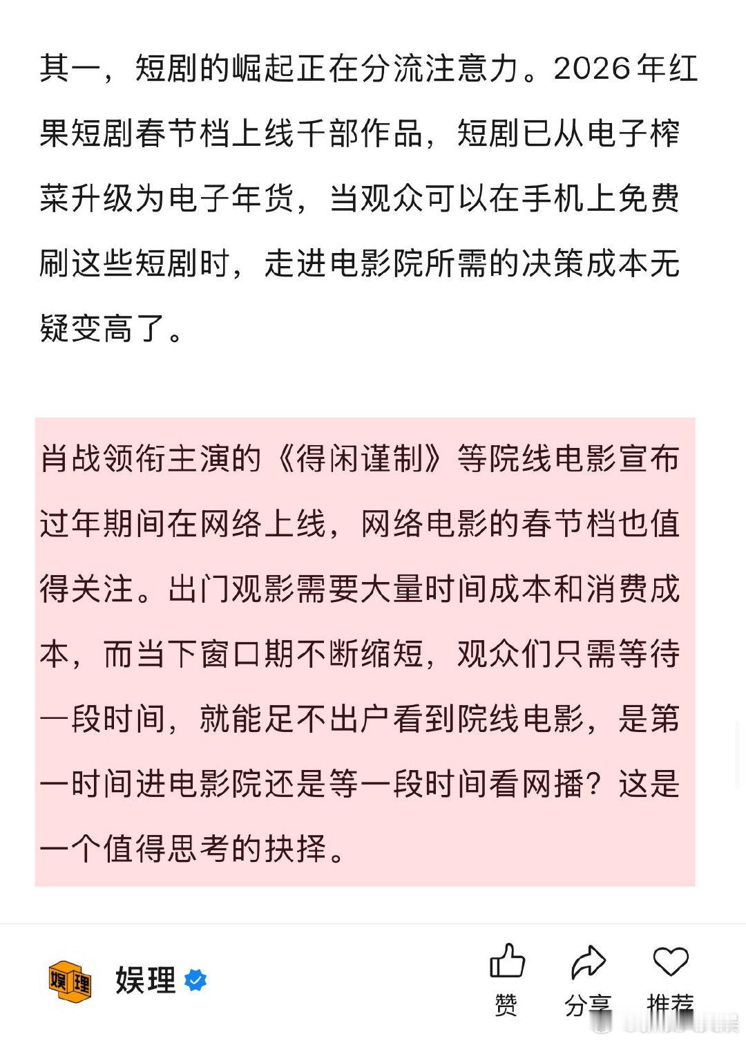 春节档电影谁会赢 2026的春节档会有奇迹吗 肖战领衔主演的《得闲谨制》等院线电影宣布过年期间在网络上线,网络电影的春节档也值得关注。出门观影需要大量时间成本和消费成本,而当下窗口期不断缩短,观众们只需等待一段时间,就能足不出户看到院线电影,是第一时间进电影院还是等一段时间看网播?这是一个值得思考的抉择。娱理独家↓