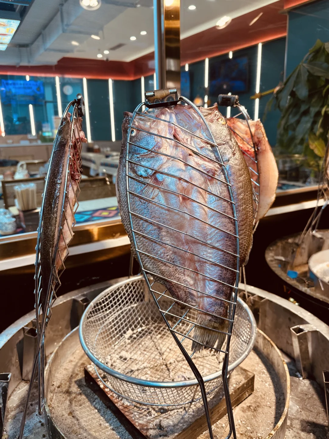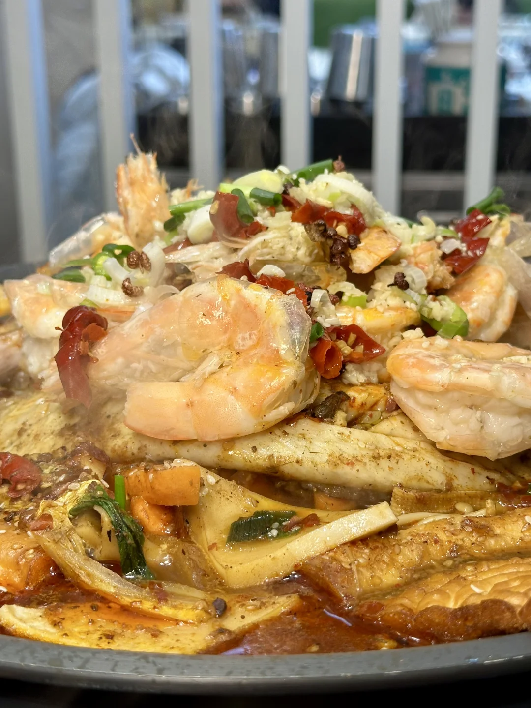 整条鱼在馕坑里慢火炙烤,外皮焦香酥脆,内里鱼肉嫩到爆汁。铺满Q弹开背大虾,每只都吸饱了秘制汤汁,鲜掉眉毛了,一上桌就是全场C位。