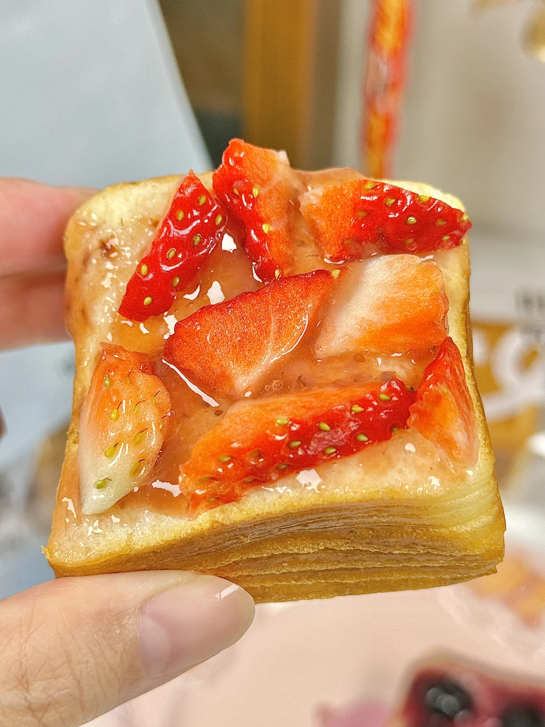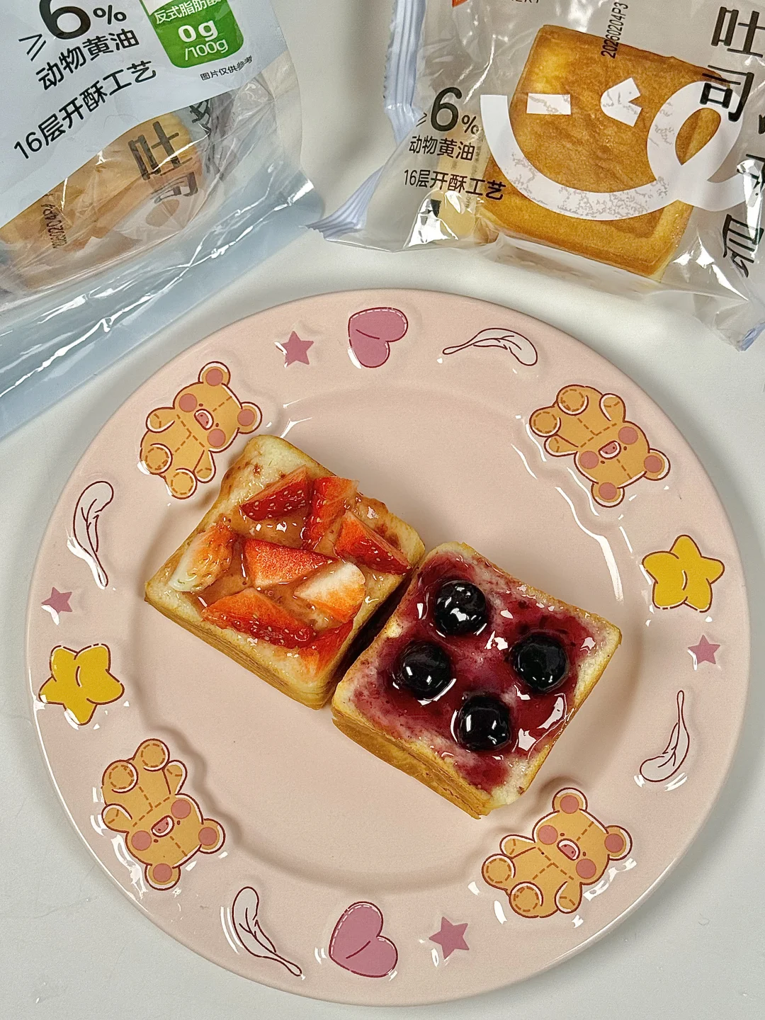 盒马这个黄油千层吐司,真的越吃越上头🍞 本来只是随便买来当早餐,结果直接被圈粉 软乎乎还带一层层酥感,奶香味很足 不是那种甜腻的,就是很舒服的黄油香 独立包装,早上拿一片超方便! 今天随手做了草莓🍓吐司和蓝莓🫐吐司 抹点草莓酱/蓝莓酱,再摆上草莓块/蓝莓,颜值和味道都在线!!! 空气炸锅烤2分钟更绝,外脆里软,香到不行 16层开酥,撕着吃真的很巴适 用料实在,0️⃣反式脂肪酸,当早餐很安心。 打工人、学生党随便搭一搭就是一顿好看又好吃的早餐 去盒马的话真的可以顺手拿几包,不踩雷~