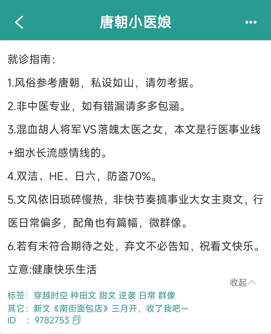 女主穿越,不黑原身,有爱情线,甜而不腻。 故事背景是唐朝,李治在位,废王立武时期。原身父亲是太医,牵扯进去,被流放,原身血书请愿跟着父亲一起流放,中途父亲溺水去世,自己遇辱服毒,现代中医学生女主穿越过来。 女主利用自己学过的中医知识治病救人,争取为自己脱罪籍,后来还找到原身的其他家人,开了个中医馆…… 偏日常向,挺好看的[赞R][赞R]