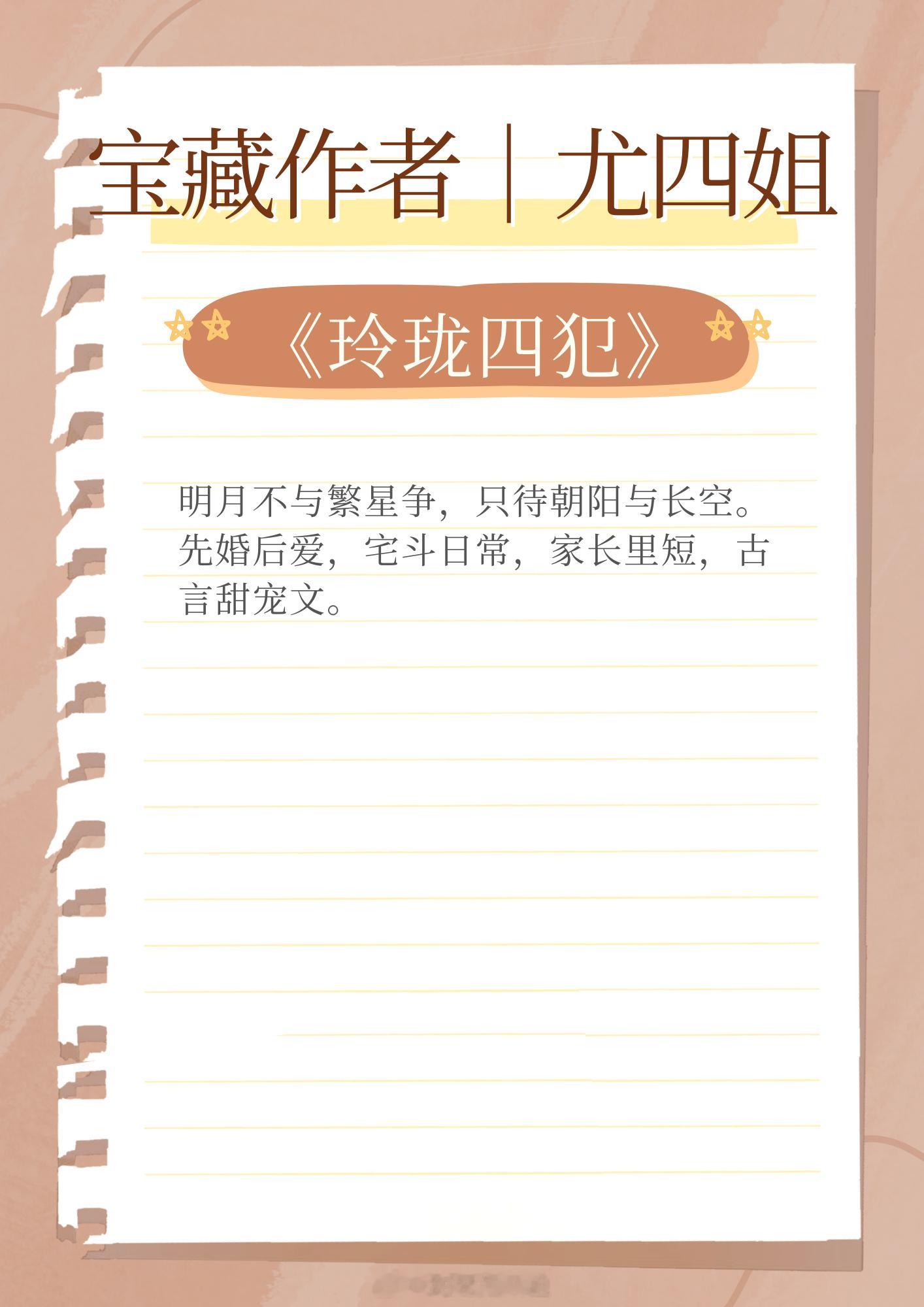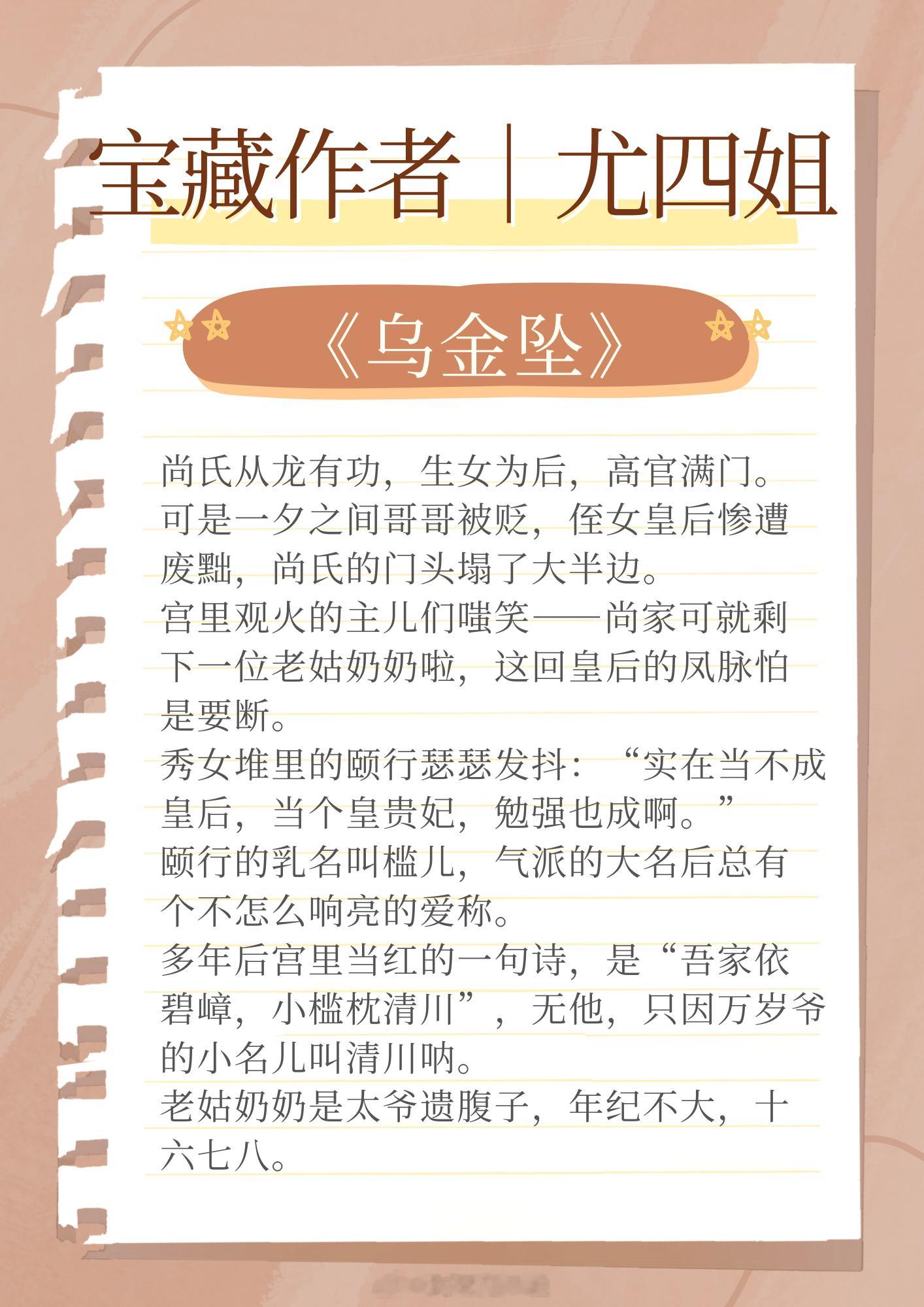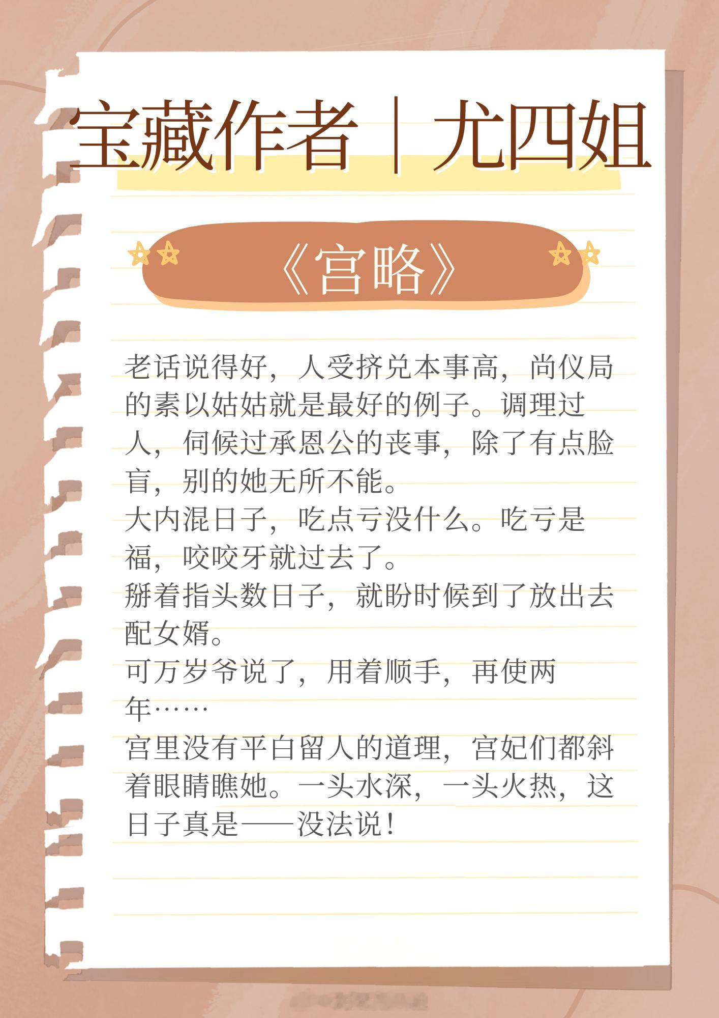 宝藏作者|尤四姐,擅写古言宫廷文,文风古色古韵。聪慧冷静女主vs温柔病弱男主:《玲珑四犯》貌美公主vs高冷王爷:《窈窕如她》聪慧豁达贵女vs纯情傲娇皇帝:《乌金坠》聪慧脸盲宫女VS腹黑醋缸皇帝:《宫略》坚韧落魄贵女vs清冷耳聋王爷:《红尘四合》漂亮心机女主vs腹黑狠辣男主:《一瓯春》这小说写在我心趴上了 让我吹爆的宝藏小说